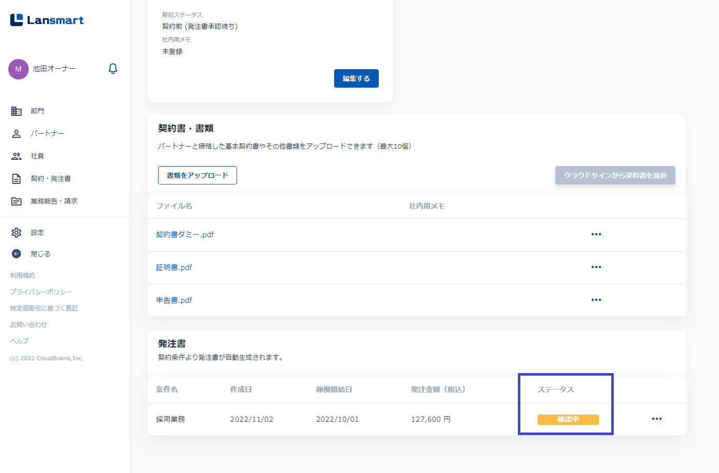 送信後はパートナーの発注書一覧画面に遷移し、発注ステータスが「確認中」と表示されます。