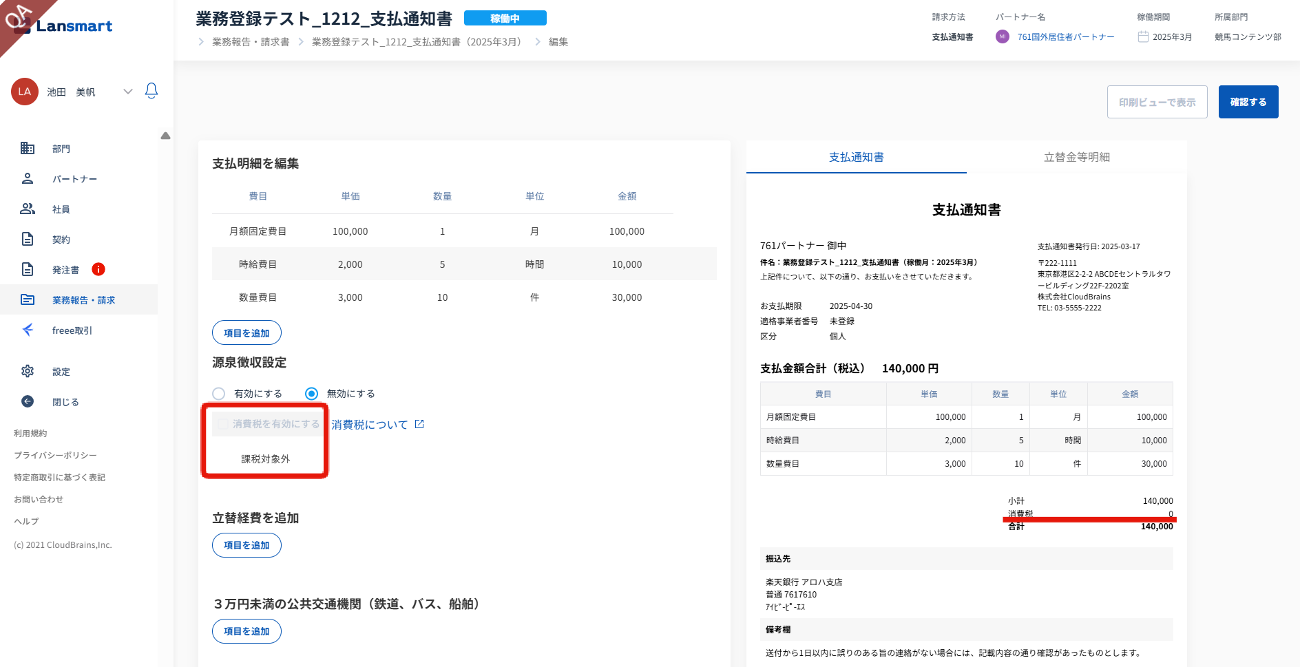 Lansmart by SmartHR上でパートナー様が「国外居住者かつ国外での役務提供」について「該当する」として登録している場合は、日本における消費税の対象外となる取引に該当しますので、支払通知書の作成画面では自動的に「消費税を有効にする」の☑が外れ、課税対象外として発行されます。