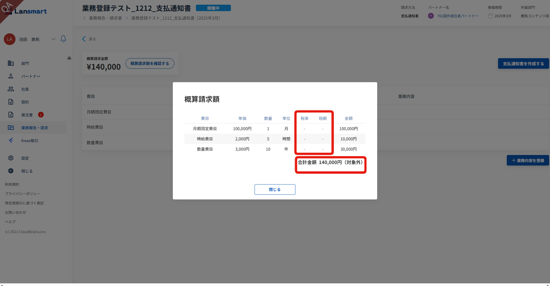 概算請求金額のモーダルについても、税率・税額は非表示となります。