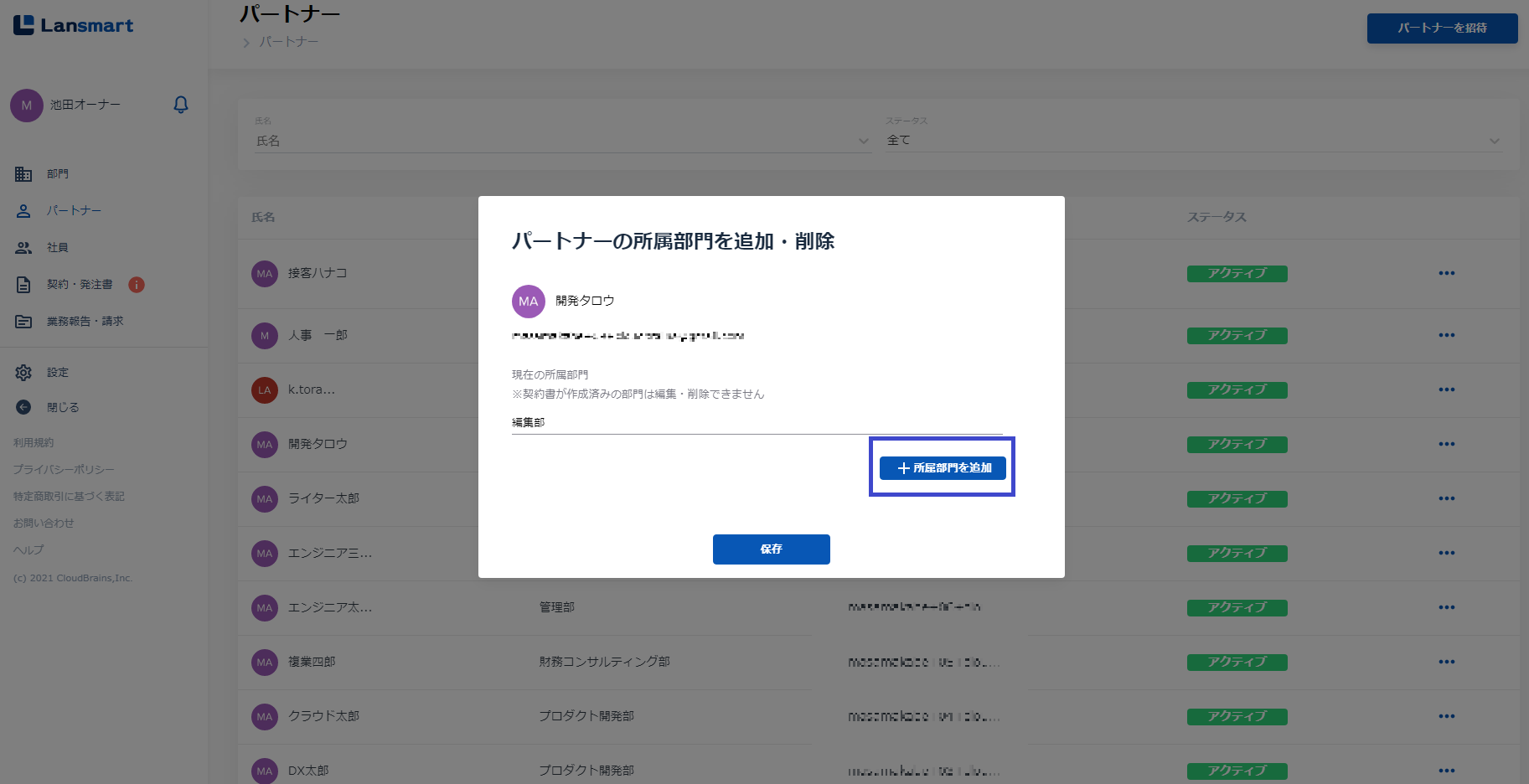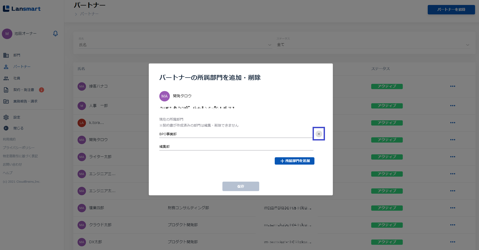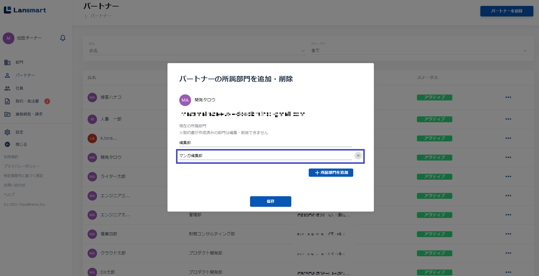 パートナーの所属グループを追加・削除する(動画) (BPO事業部を削除し、マンガ編集部を追加する)