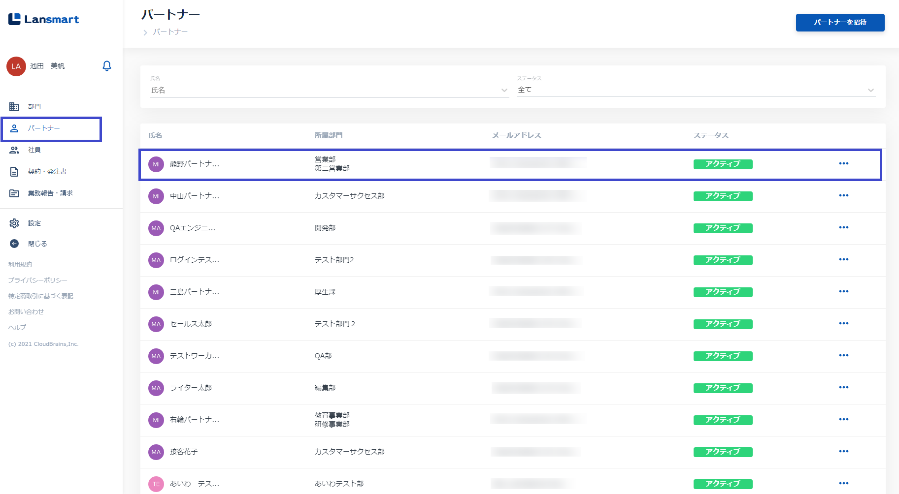 左メニューの「パートナー」をクリックし、詳細情報を見たいパートナーを選択しクリックします。
