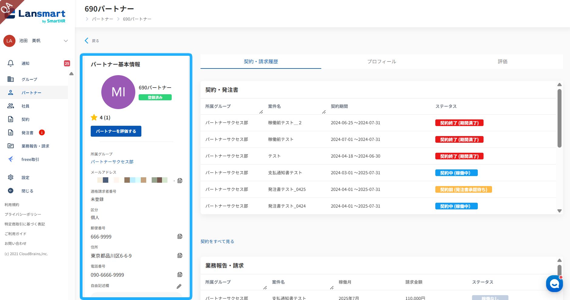 パートナー詳細情報では、そのパートナーの契約や業務報告・請求を一覧で見ることができます。 また、表示されている個別案件をクリックすると、契約及び業務報告・請求のさらに詳しい情報を見ることができます。