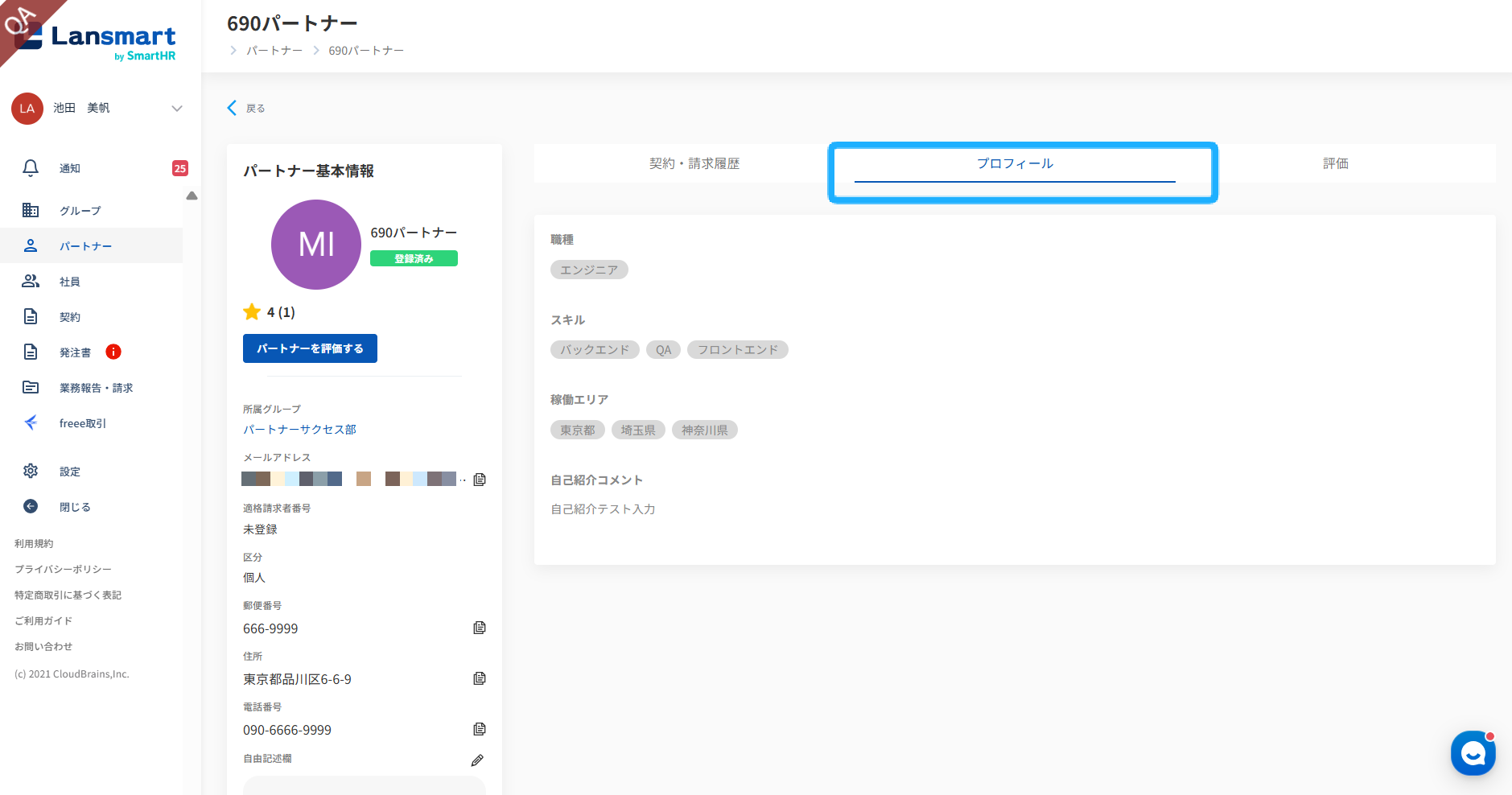 パートナーのプロフィール情報では、所属グループ、メールアドレス、適格事業者番号、個人法人区分、郵便番号、住所、電話番号が表示されます。 ※メールアドレス、郵便番号、住所、電話番号は右横の📄マークをクリックすることで簡単にコピーできます。 所属グループはリンクされていますので、リンクからグループのメンバー一覧を確認することができます。