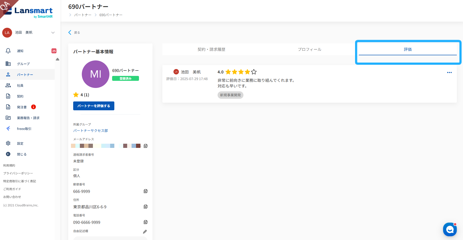 「評価」タブに切り替えますと、登録されたパートナーの評価を確認することができます。 パートナーの評価の登録方法については、こちらのページをご確認ください。