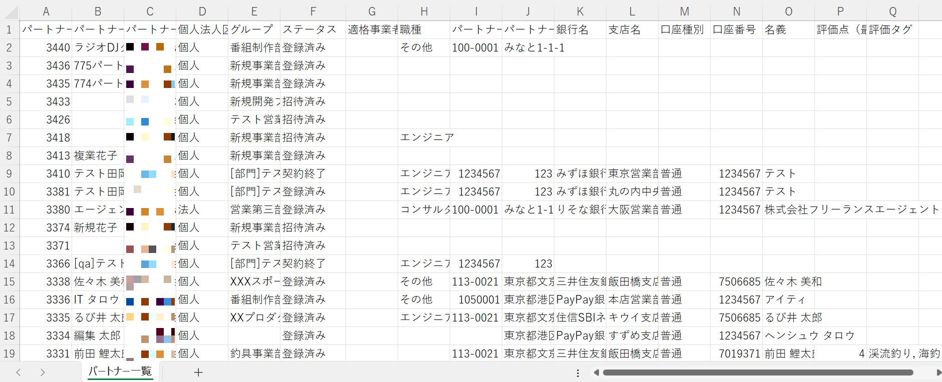 CSVでは以下の情報が出力されます。(住所や口座情報が登録されていない場合は空欄で出力されます)