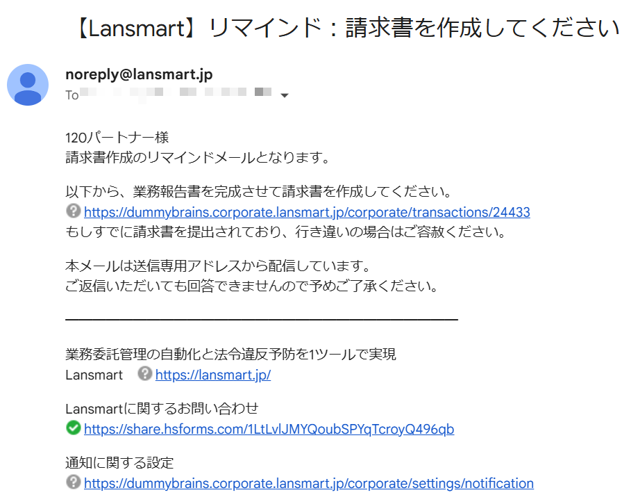 パートナー様には「【Lansmart】請求書を作成してください」という件名のメールが送付され、メール本文内のURLから業務報告・請求書の作成ページに遷移できます。