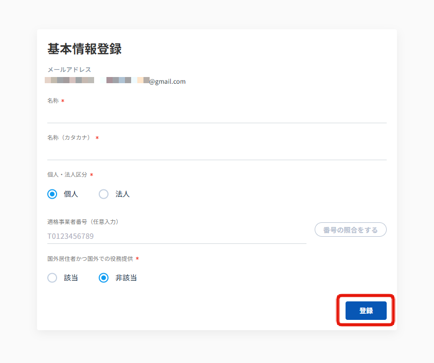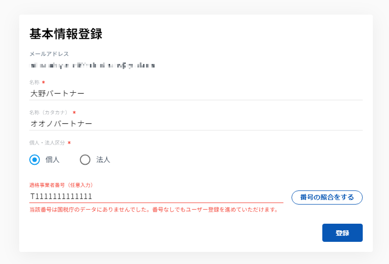 ※適格事業者番号とは、適格請求書(インボイス)に記載が必要な番号です。登録は任意ですので、未登録でも先に進むことができます。