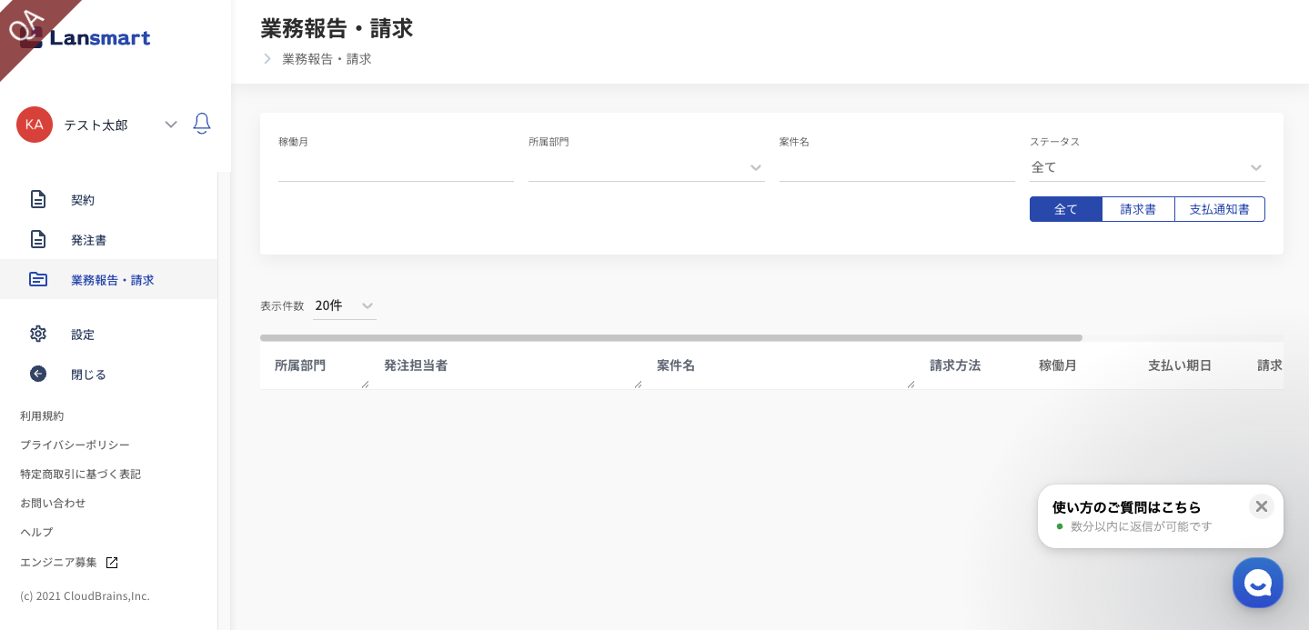 業務報告書・請求書一覧に切り替わりましたらこれでアカウント登録は完了です。