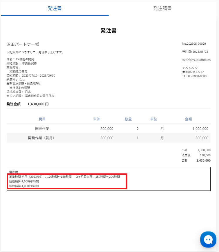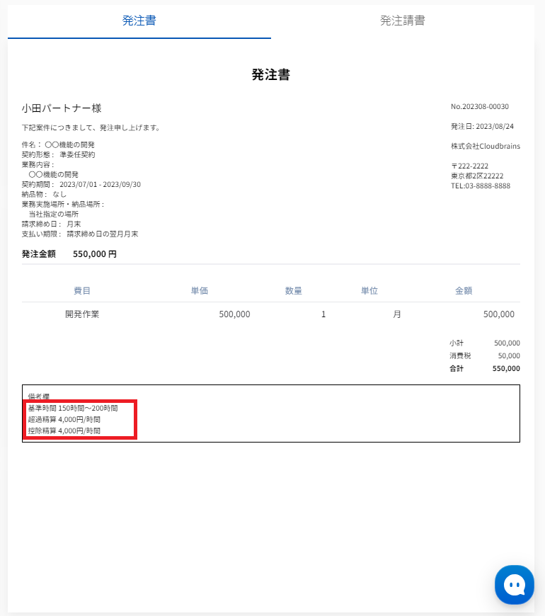※請求方法が請求書での対応の場合(パートナー様が請求書を発行する場合)は、備考欄に上記の文面の記載はございません。