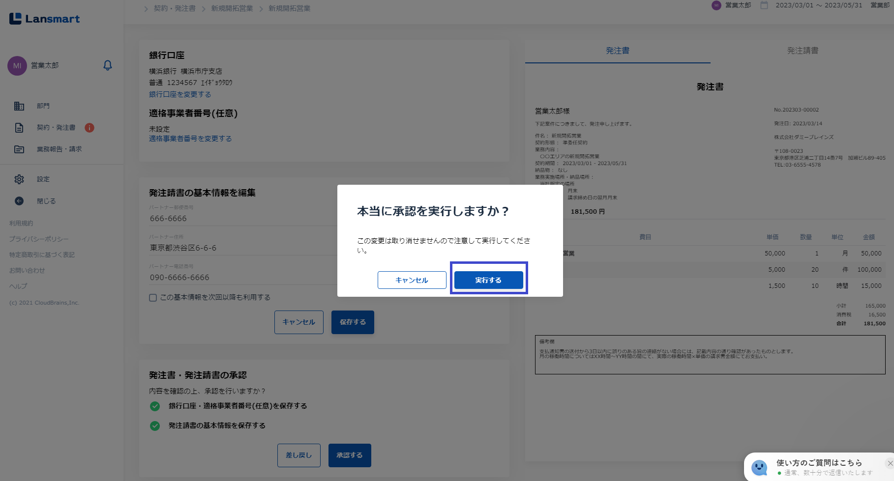 「本当に承認を実行しますか?」の確認メッセージが出るので「実行する」ボタンを押します。