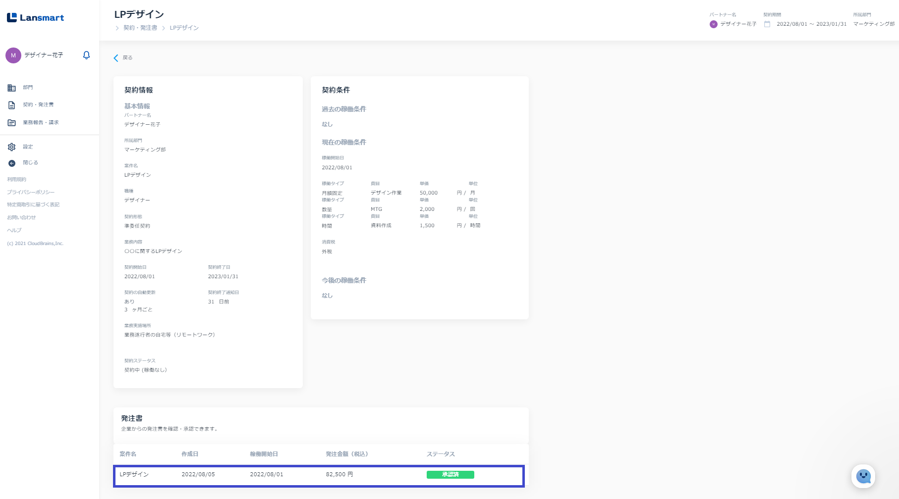 案件をクリックすると契約詳細画面に遷移し、画面左側には企業側と合意した稼働条件が表示されています(発注書はこの条件をもとに生成されています)。