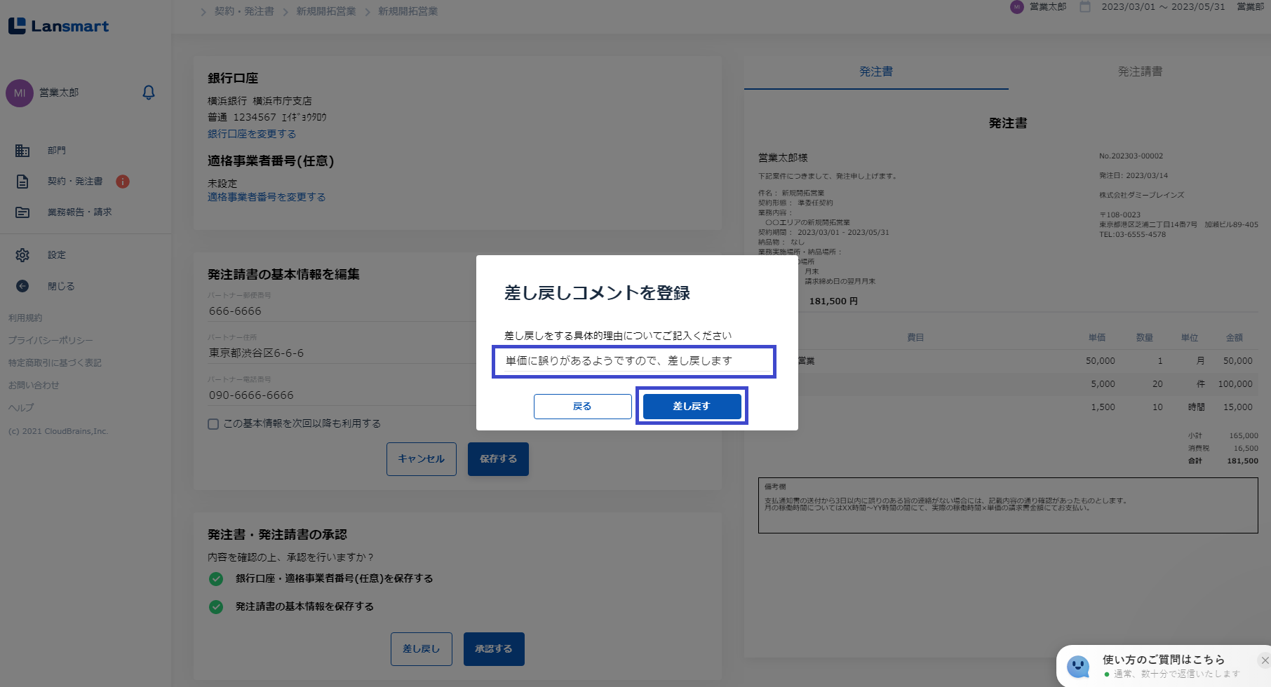業務委託契約をする企業(グループ)から送られてきた発注書の内容に不備などがあった場合に差し戻す方法についてご説明します。