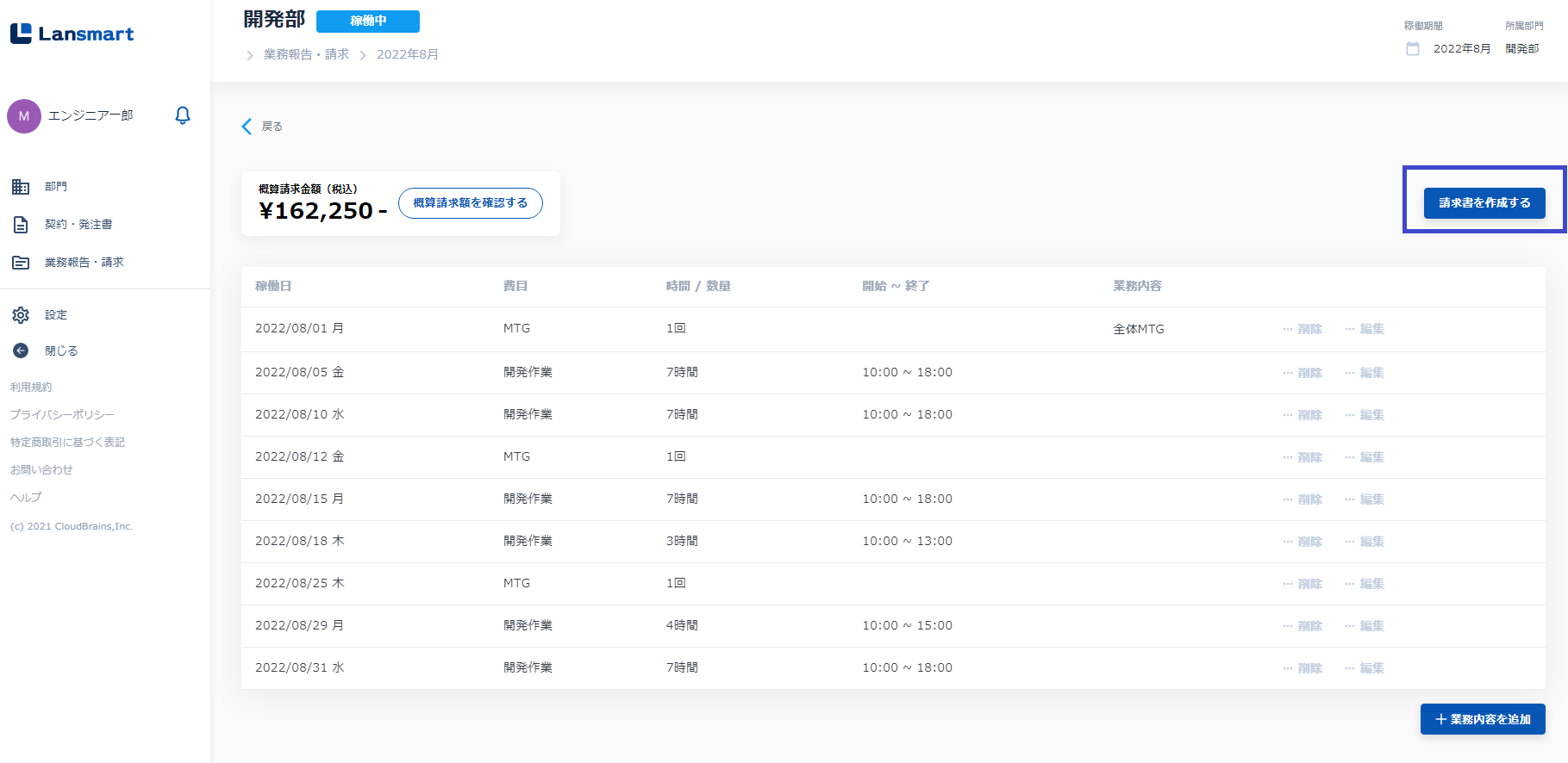 業務報告画面に登録した内容と、概算請求金額が表示されます。稼働があるごとにこちらのページで業務登録を行ってください。