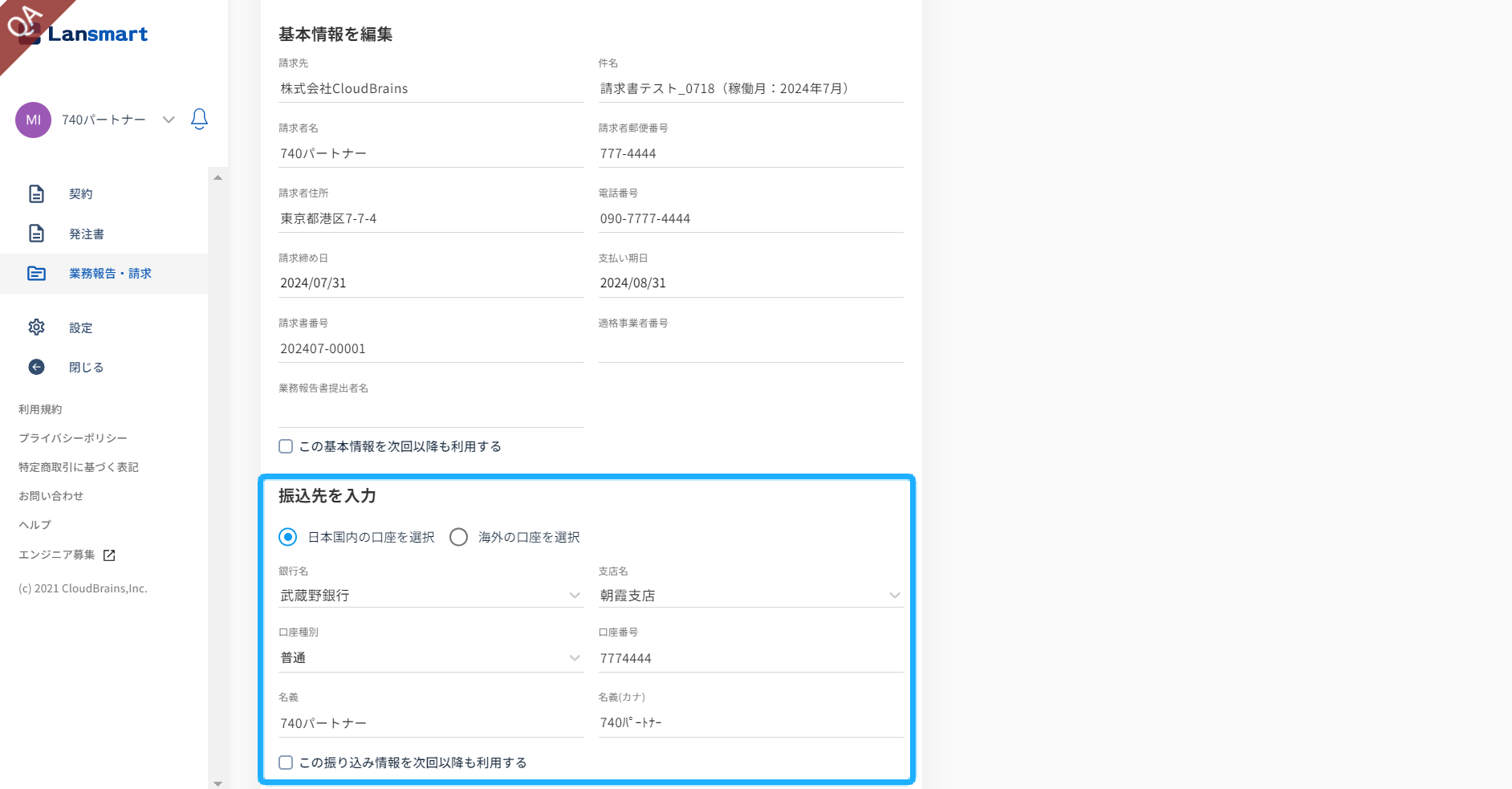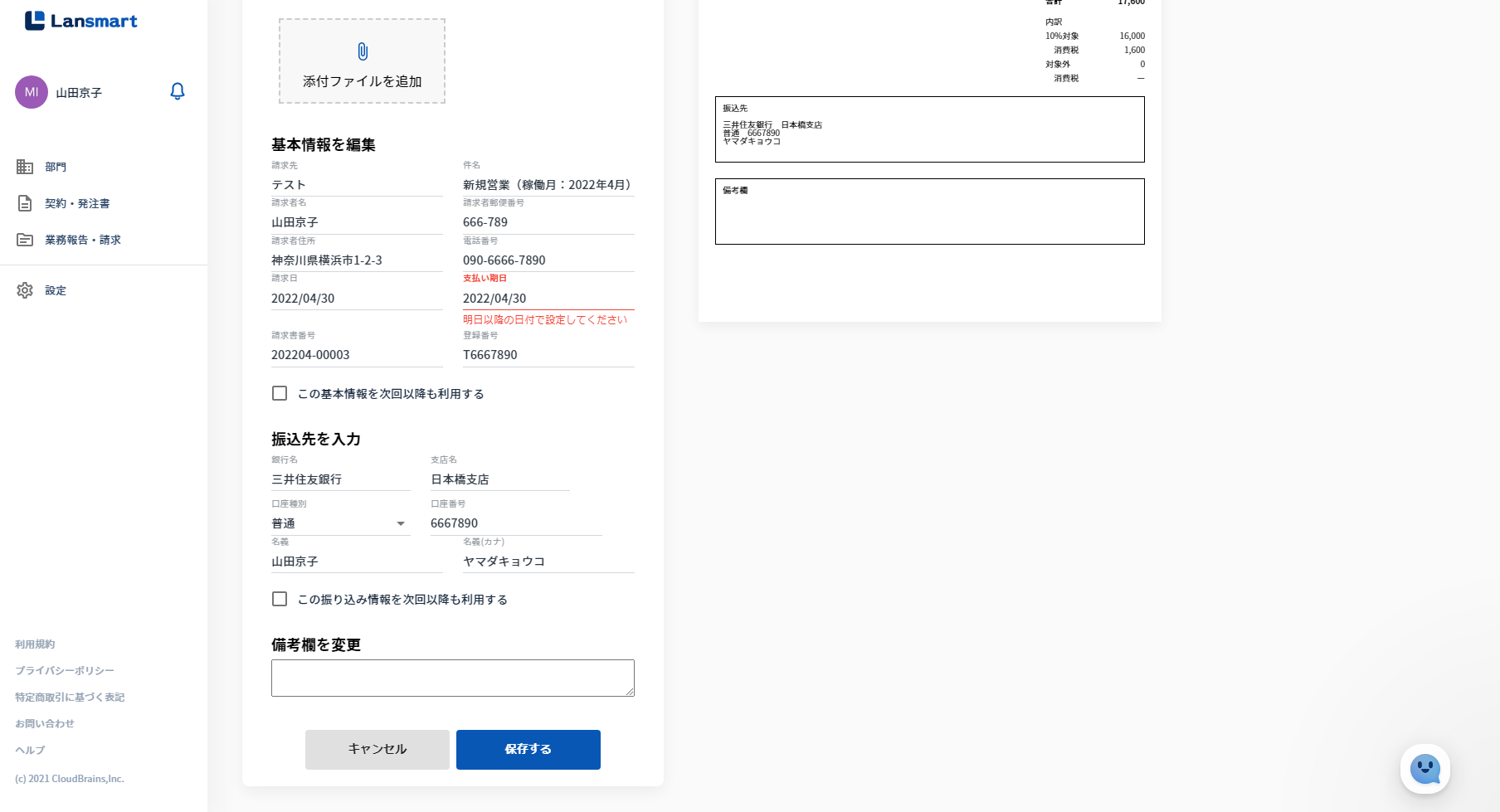 (振込口座、適格事業者番号が設定画面で登録されている場合には、登録情報が自動で反映されています。)