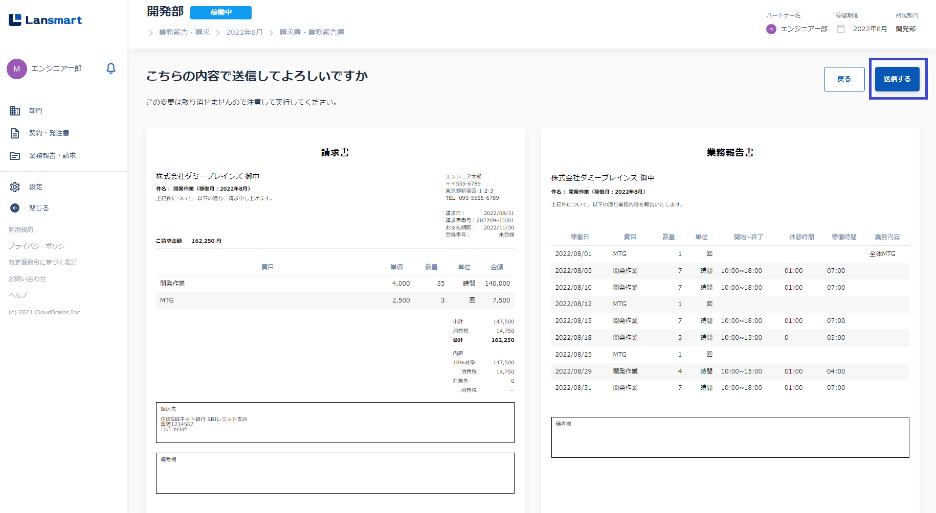 Lansmart by SmartHRでは、パートナーが入力した業務登録から、業務報告書と請求書を自動生成できるため、パートナーの方の業務報告・請求書作成の手間を大幅に削減することが可能です(特許取得済み)。