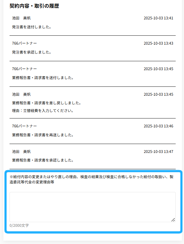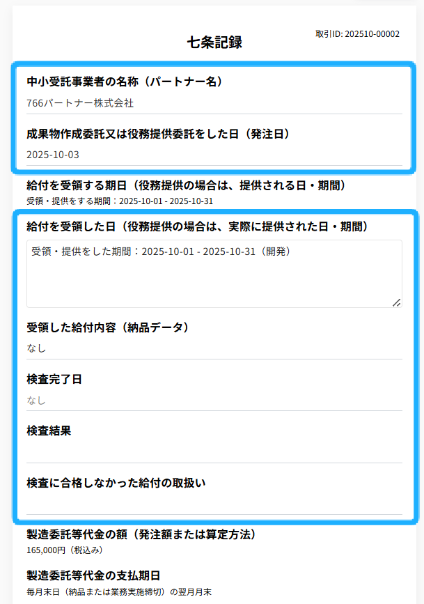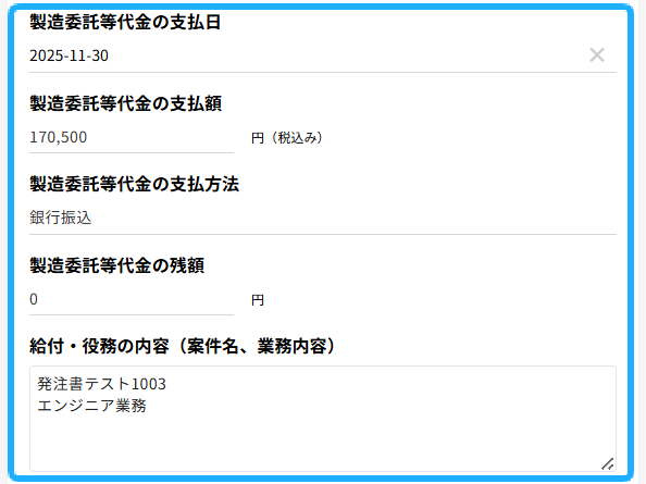 給付内容の変更またはやり直しの理由、検査の結果及び検査に合格しなかった給付の取扱い、製造委託等代金の変更理由等