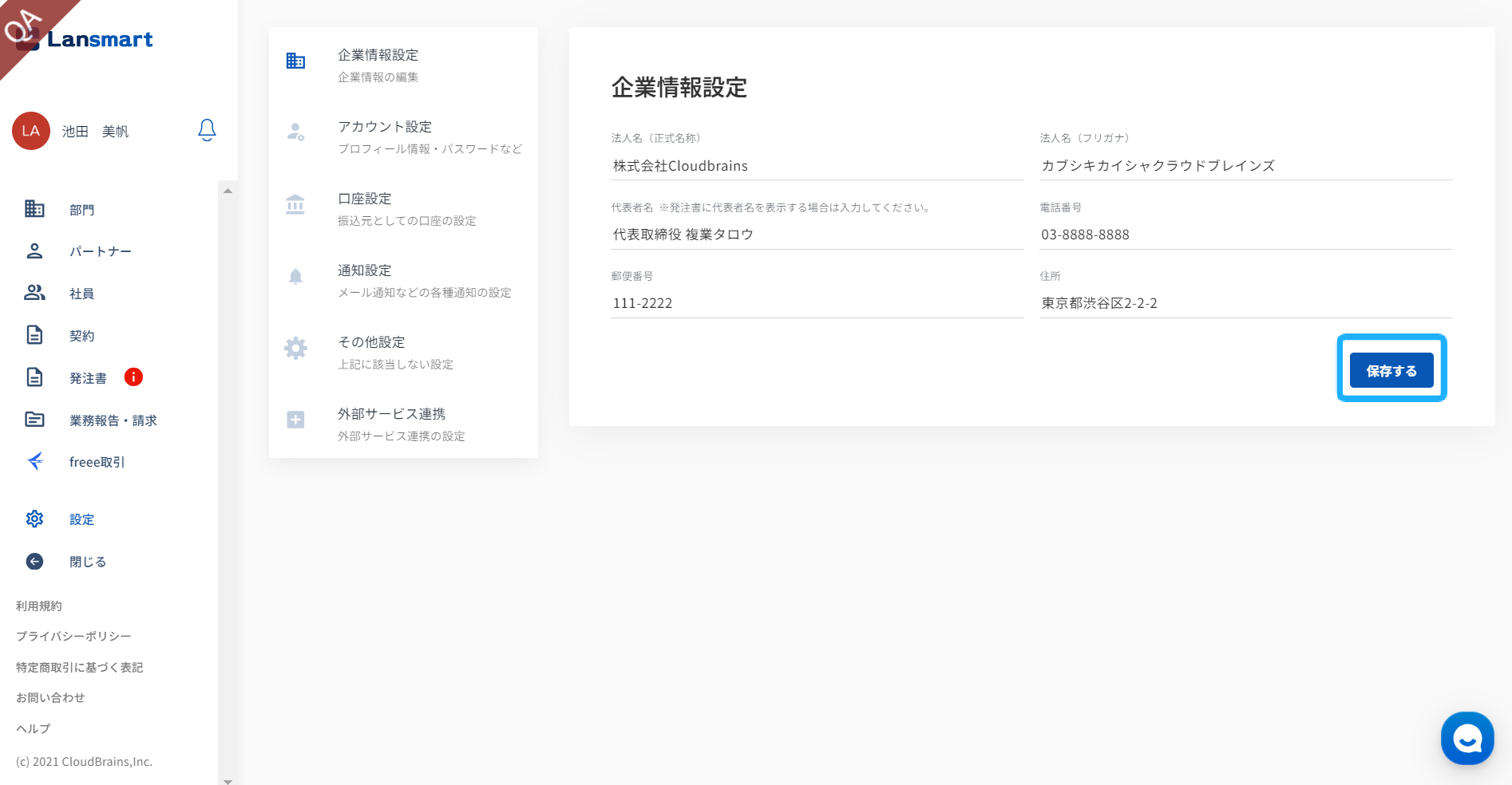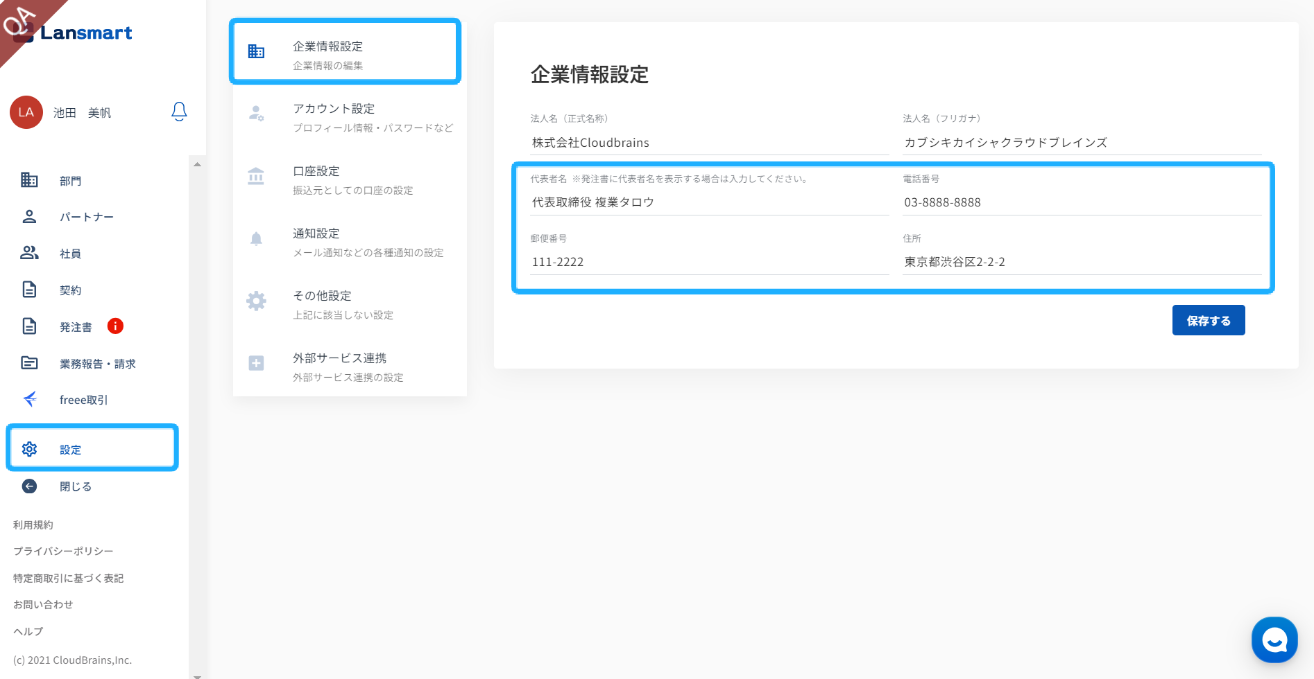 左メニューの「設定」をクリックし、「企業情報設定」から代表者名の登録を行います。 例)代表取締役 複業タロウ (任意項目ですので、登録なしでも保存することができます)