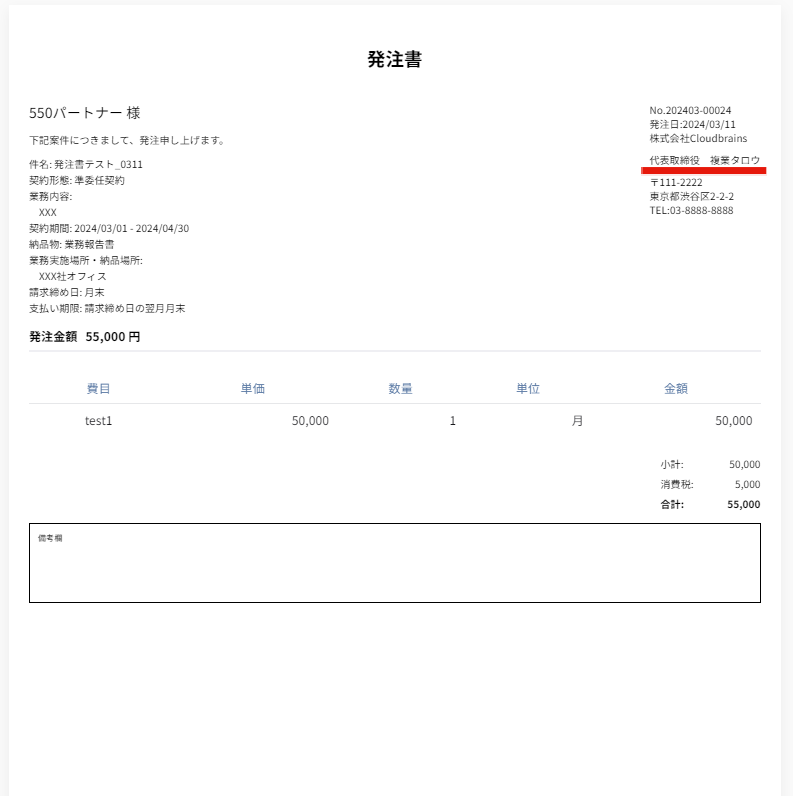 代表者名を設定した場合、発注書では下記のように表示されます。
