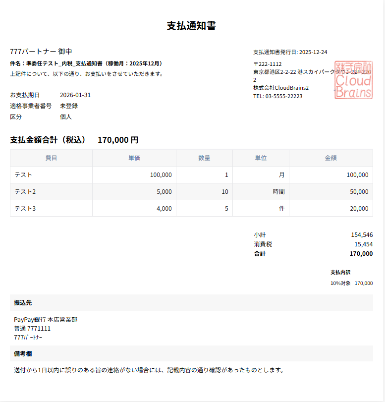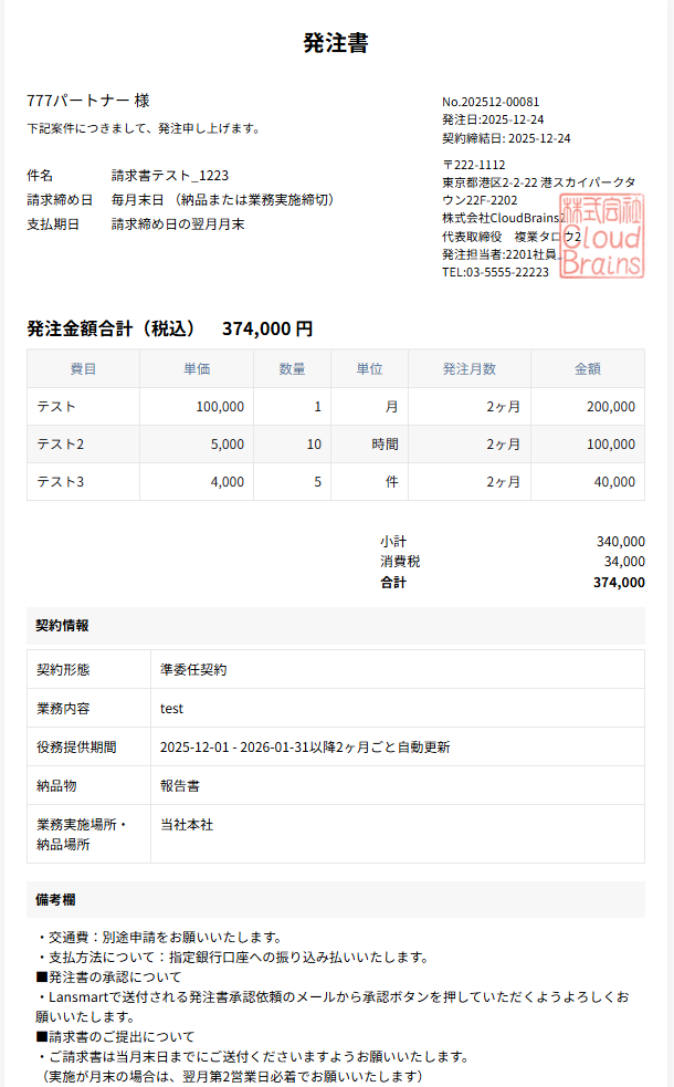 設定した電子印影は、すべての発注書・支払通知書に自動的に適用されます。