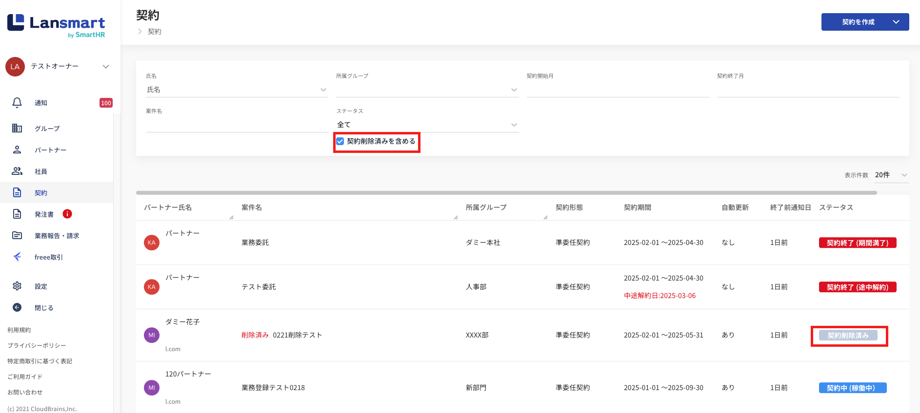 契約一覧では、「契約削除済みを含める」に☑を入れた場合のみ、契約削除済みの契約が表示されます