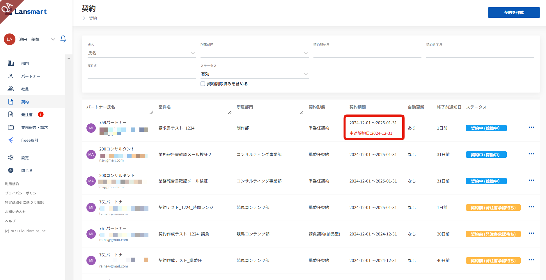 契約一覧では、契約期間下部に設定した中途解約日が赤字で表示されます。