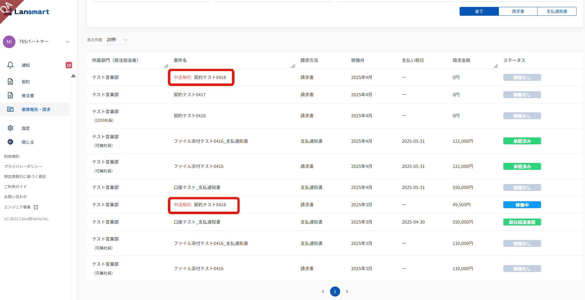 業務報告・請求一覧では、中途解約された契約の案件名の横に赤字で「中途解約」と表示されます。