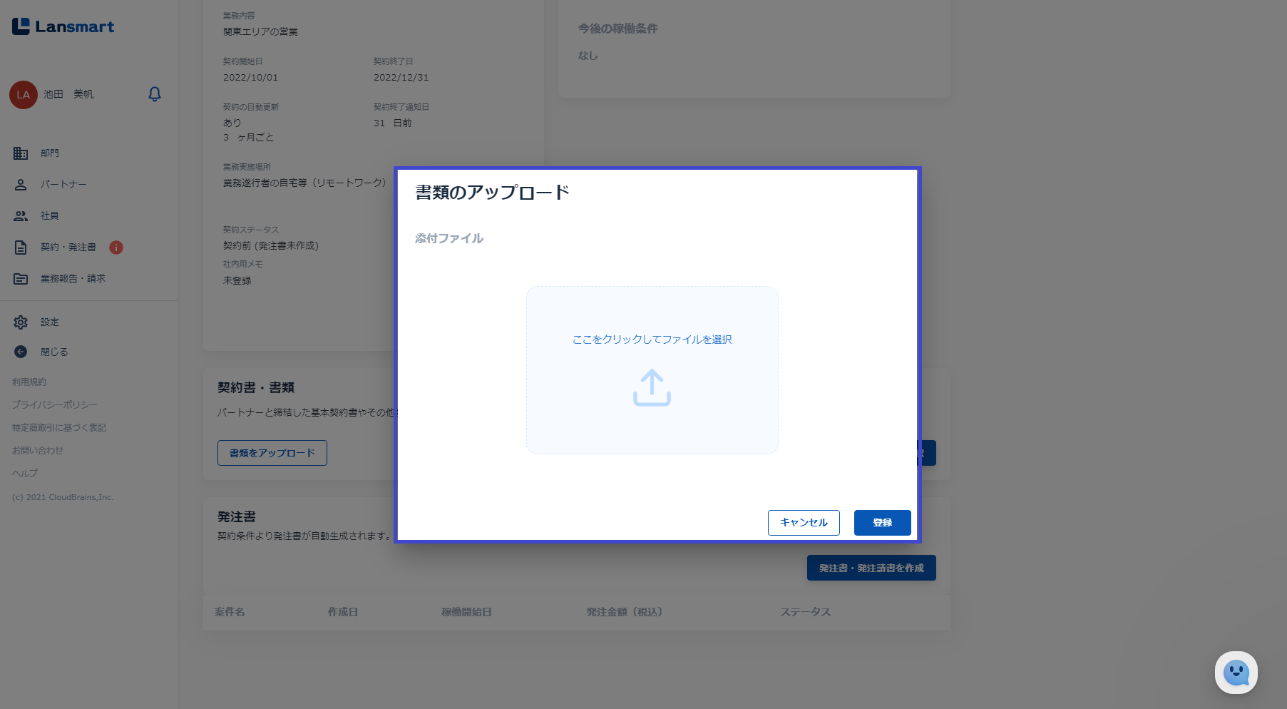クラウドサインと連携することで、契約書をアップロードすることもできます。 (複数書類の登録が可能です)詳しくはこちらをご覧ください。