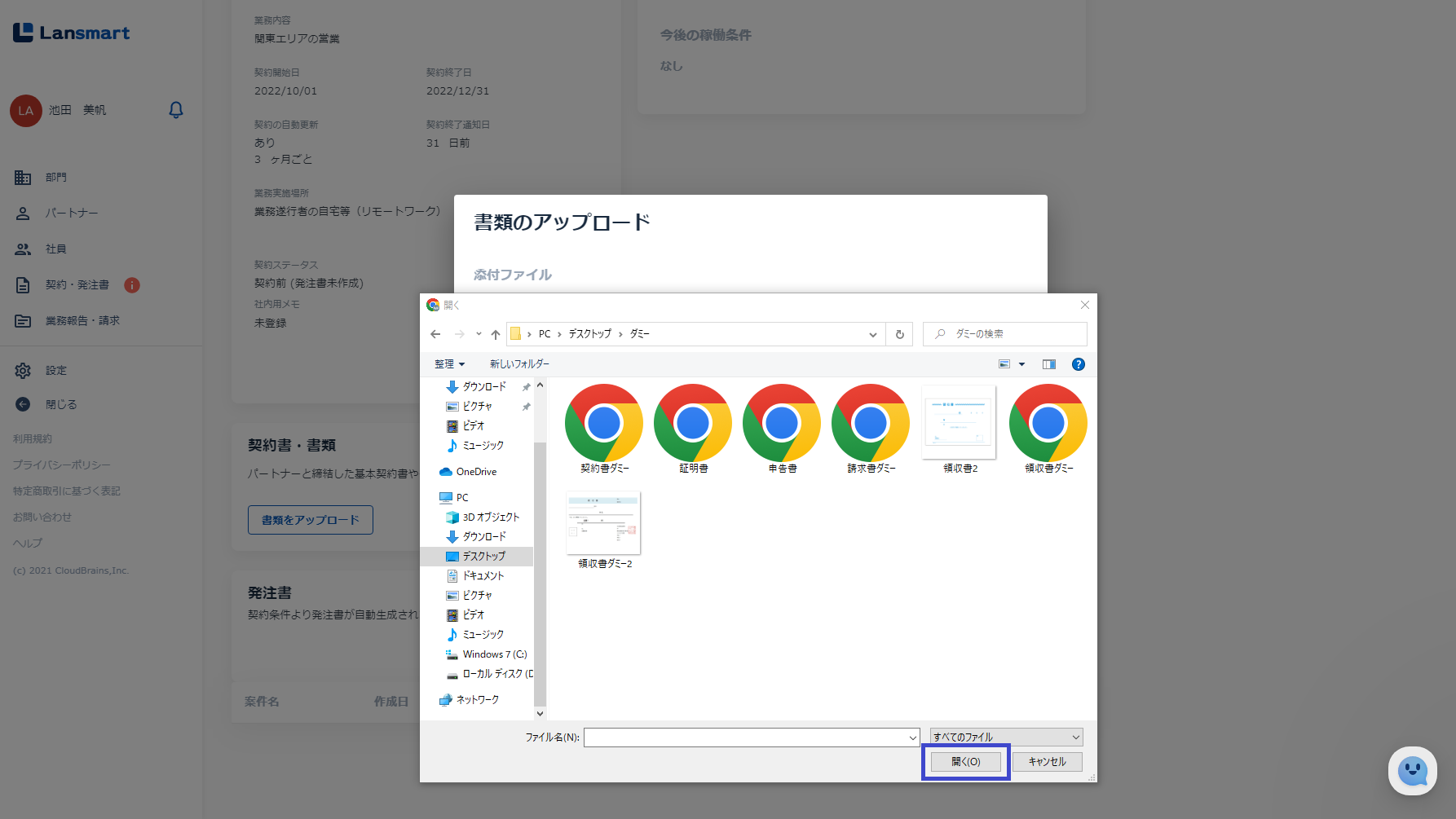 「書類をアップロード」をクリックすると、ダイアログが表示されます。