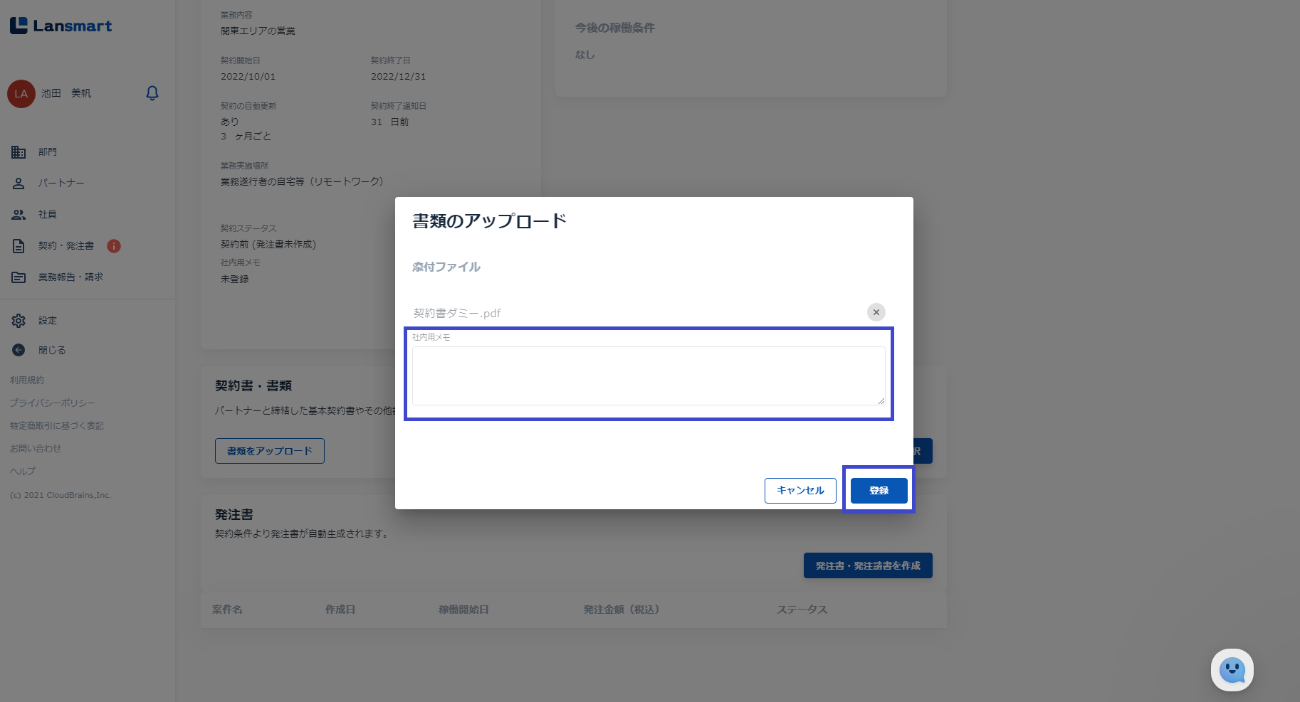 何か記載する事項があれば、社内メモ欄に入力することができます。「登録」ボタンをクリックすると、ファイルのアップロードが完了です。