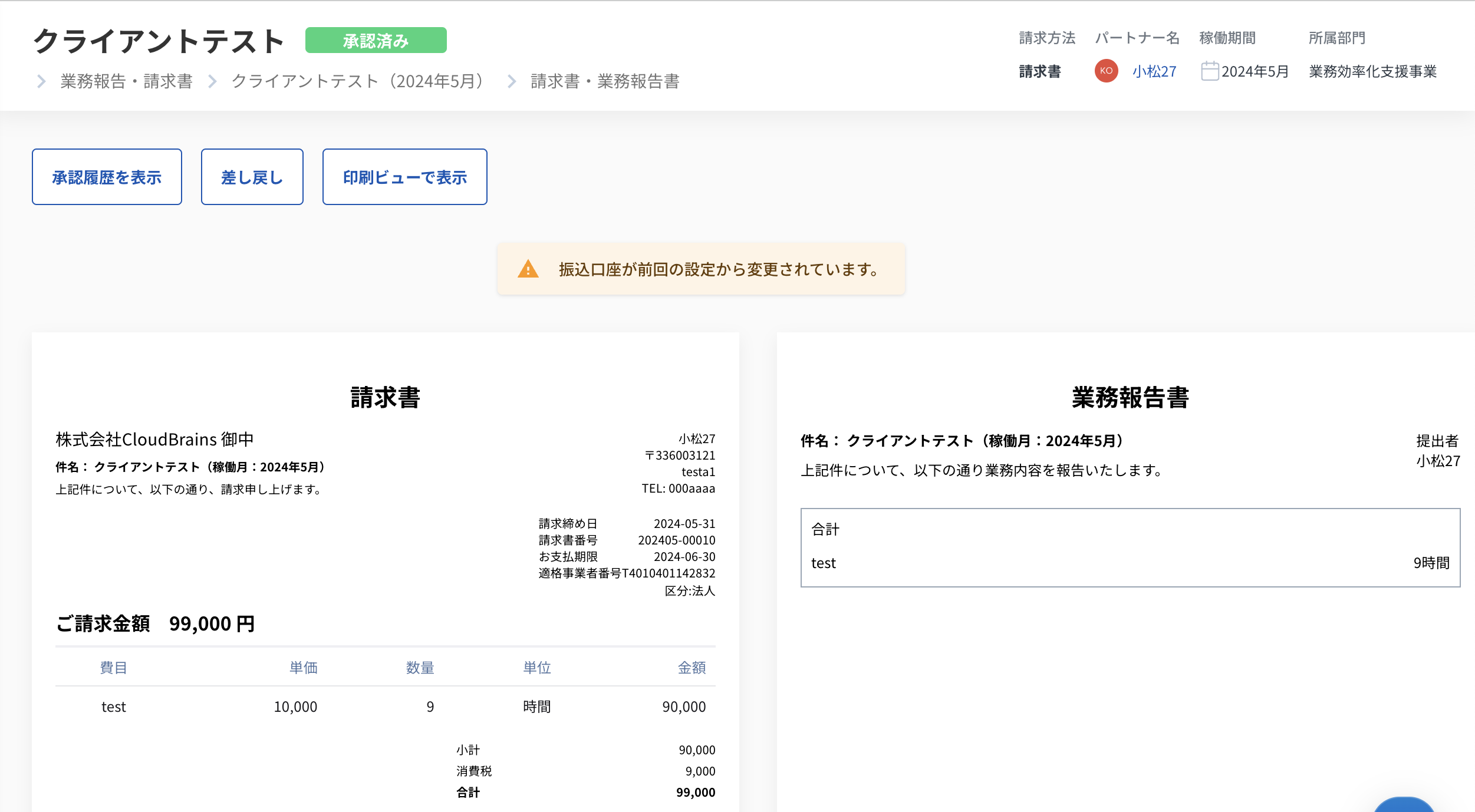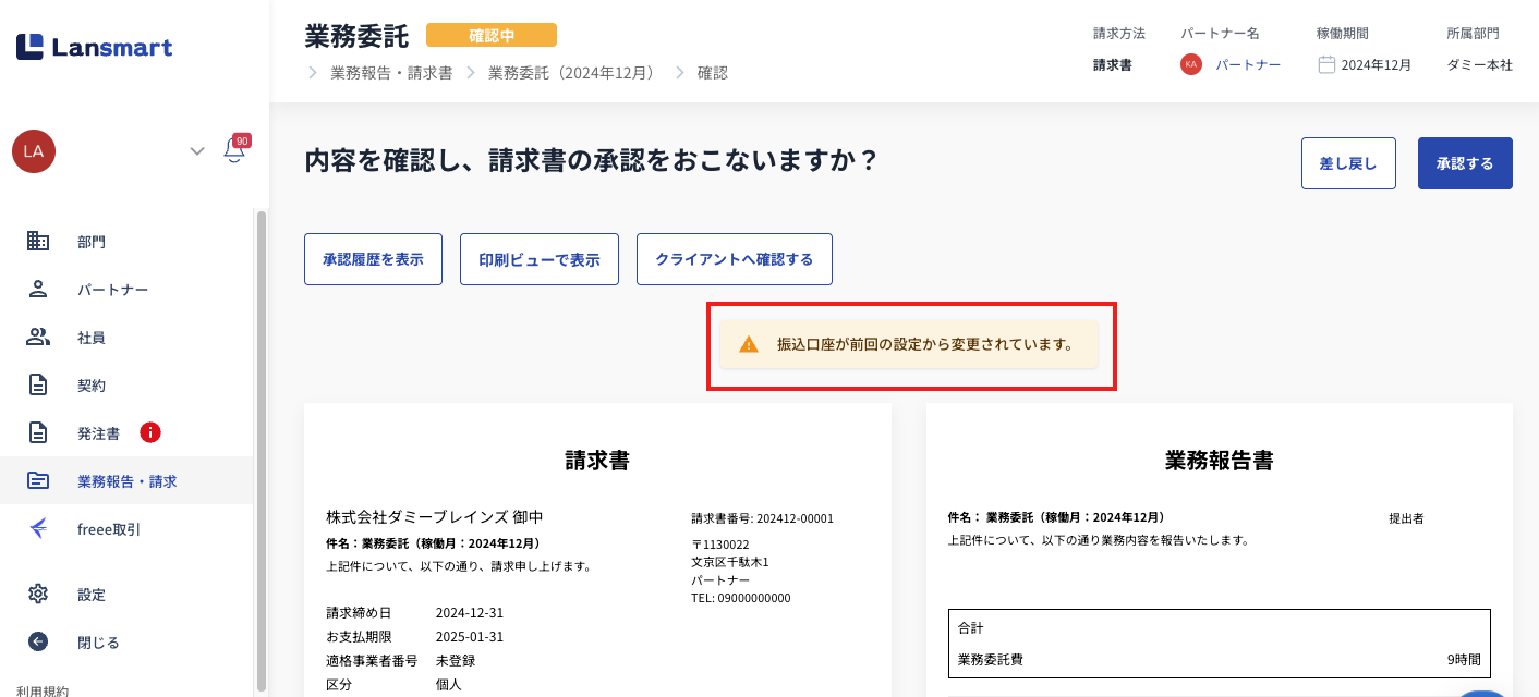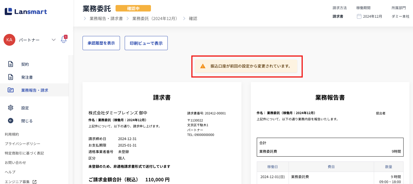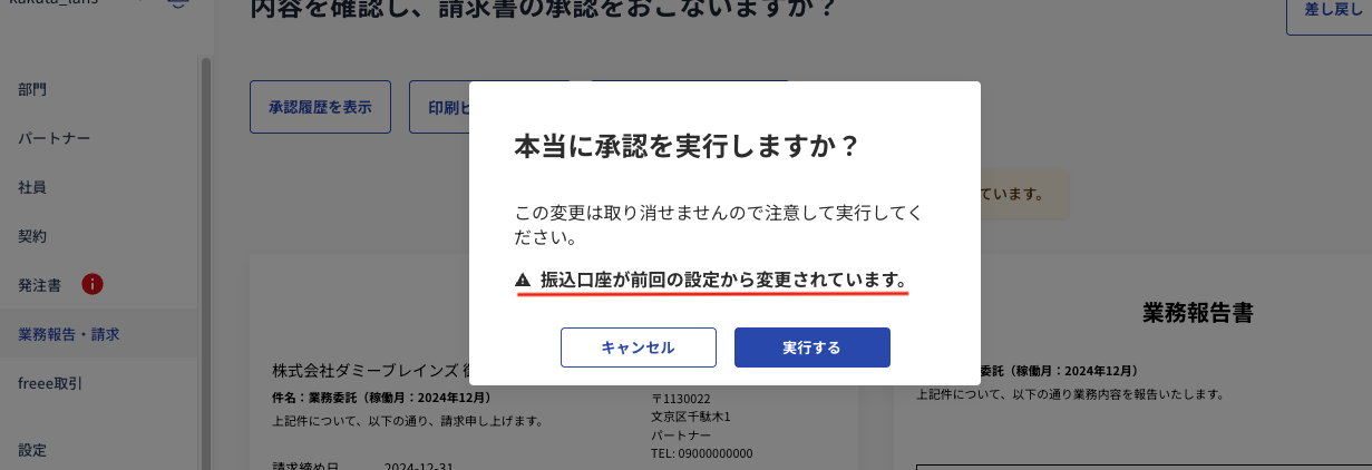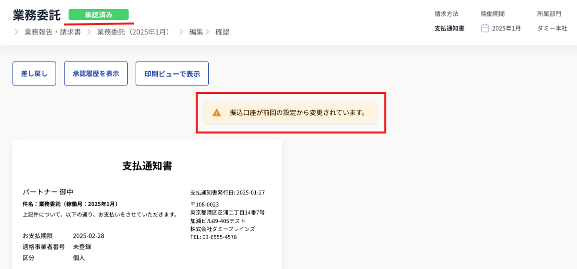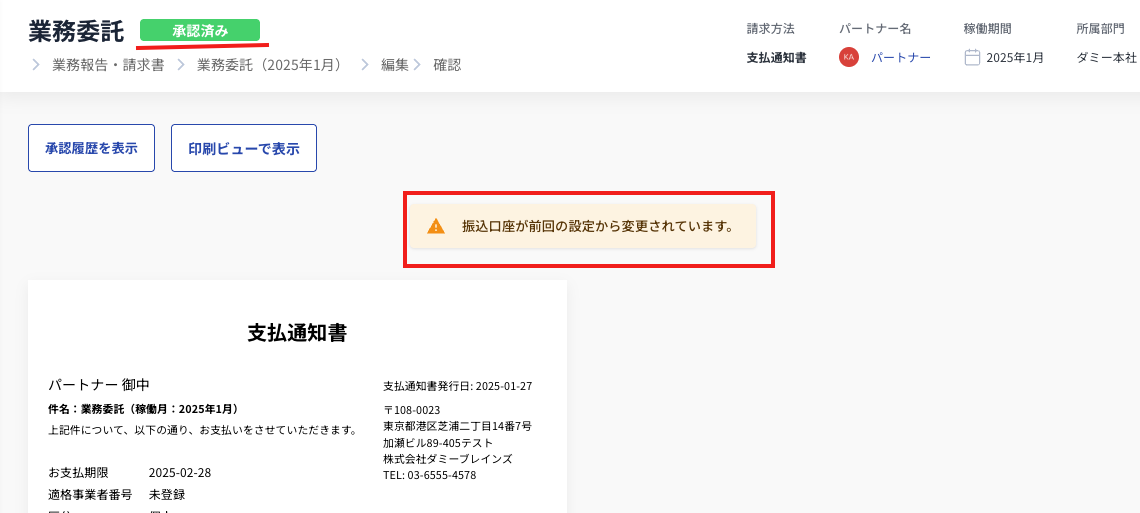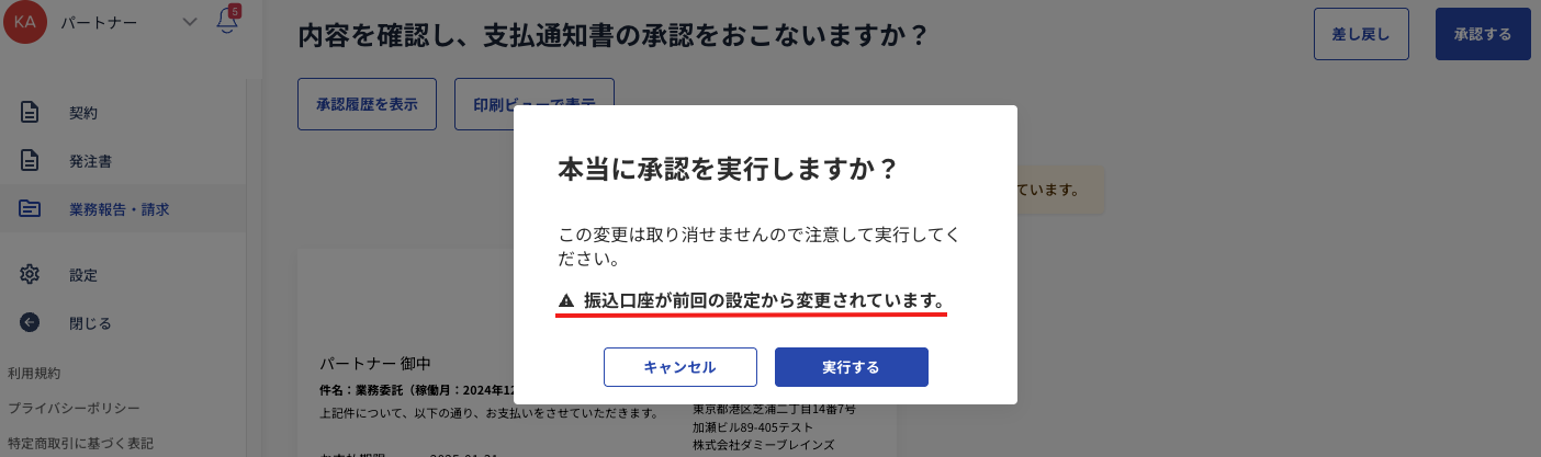 尚、パートナー様の振込口座が前月の請求書と異なる場合、企業様側、パートナー様側の請求書・支払い通知書の承認前後の確認画面でメッセージが表示されます。 企業様が請求書を承認される際、パートナー様が支払い通知書を承認される際にも、同メッセージが表示されます。
