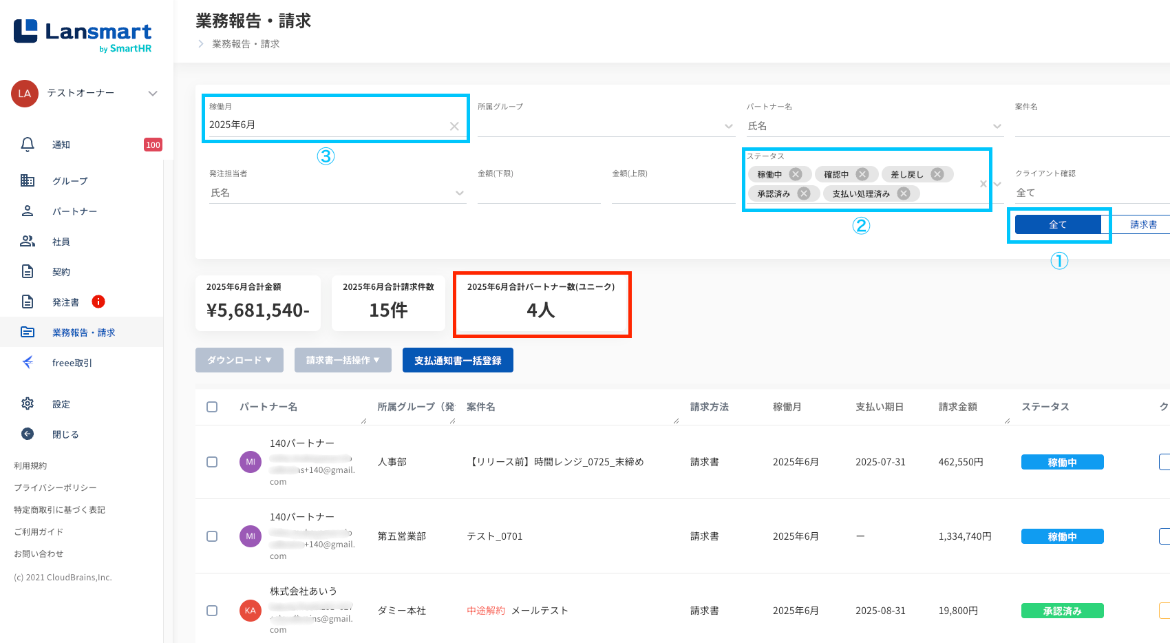 業務報告・請求一覧にて、稼働月とステータス絞り込んだ際に、合計パートナー数(ユニーク数)が表示されます。 ①一覧での表示は、「全て」にします。 ②稼働月を選択します。 ③ステータスを「稼動中」「確認中」「差し戻し」「承認済み」「支払処理済み」を選択します。 ➡赤枠部分に合計パートナー数(ユニーク)が表示されます。