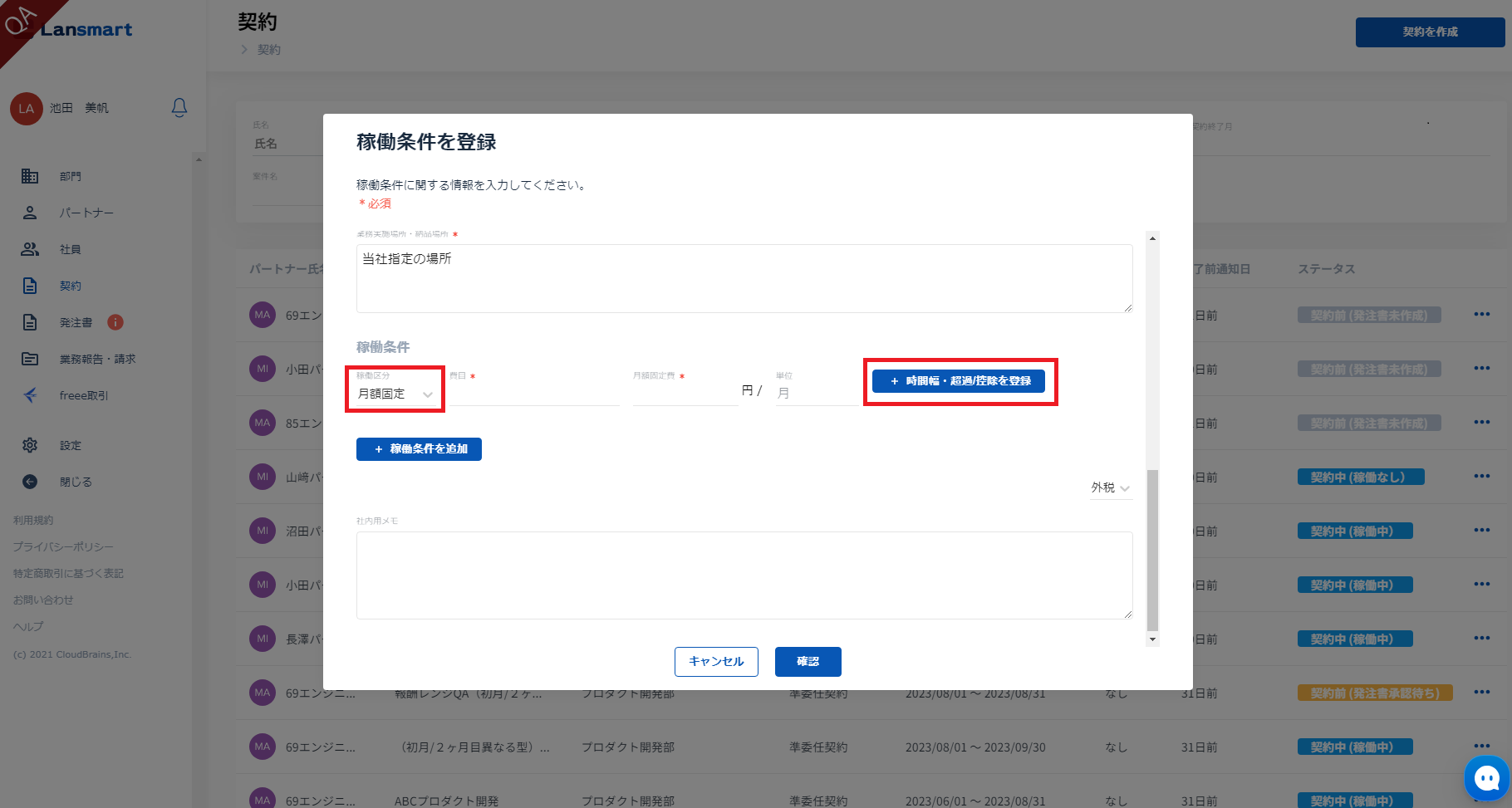 左メニュー「契約」をクリックし、右上の「契約を作成」から契約情報を登録します。稼働条件の入力箇所で、稼働タイプを「月額固定」を選択しますと、「+時間幅・超過/控除を登録」ボタンが表示されますので、クリックしてください。