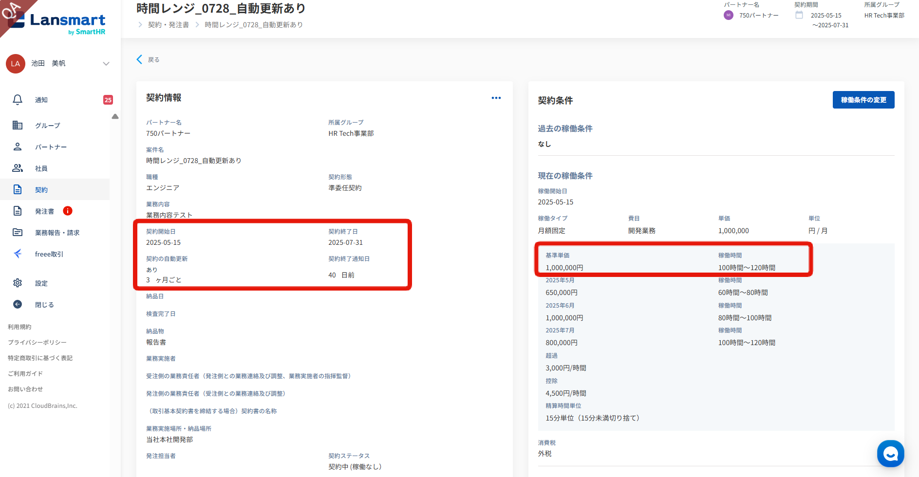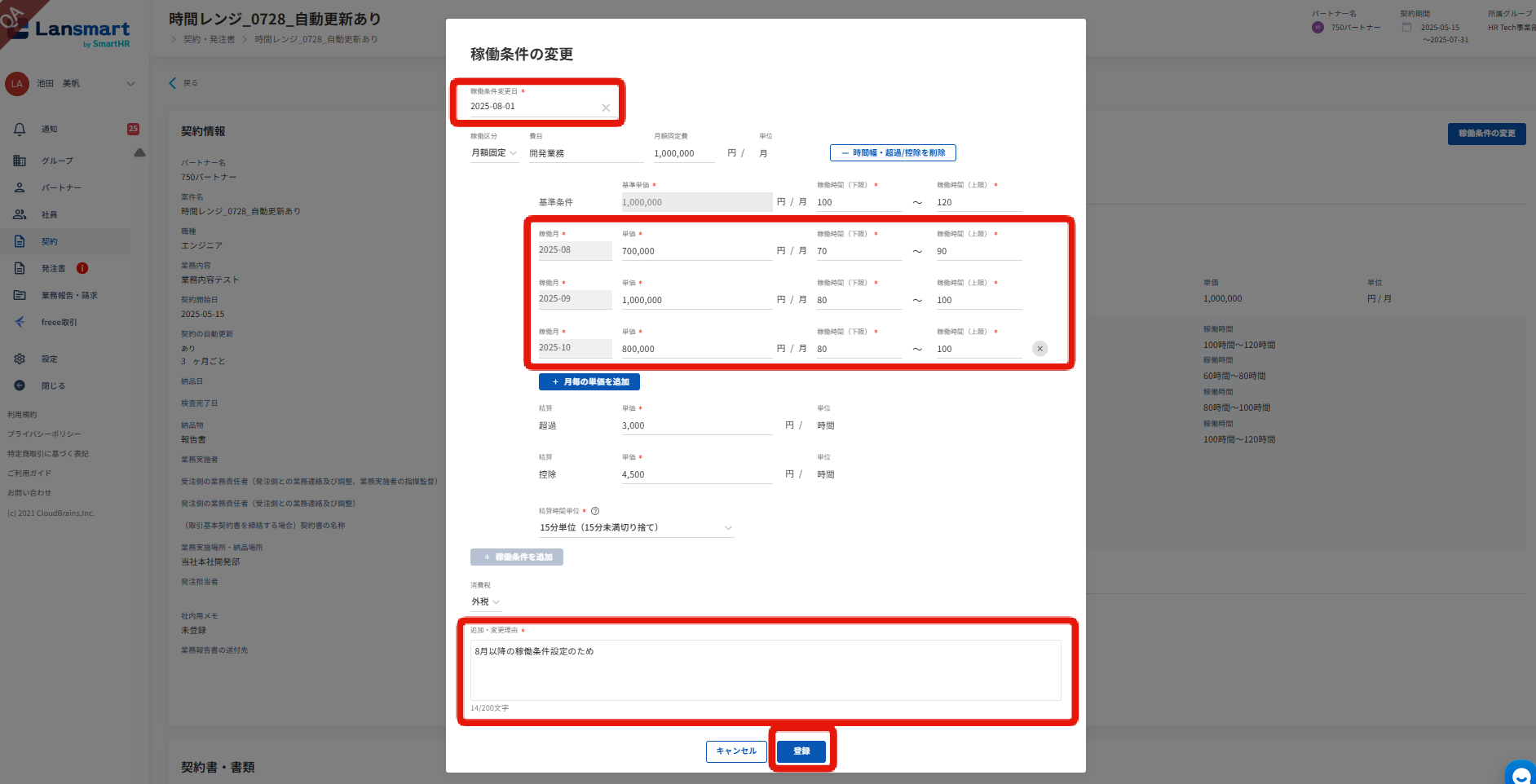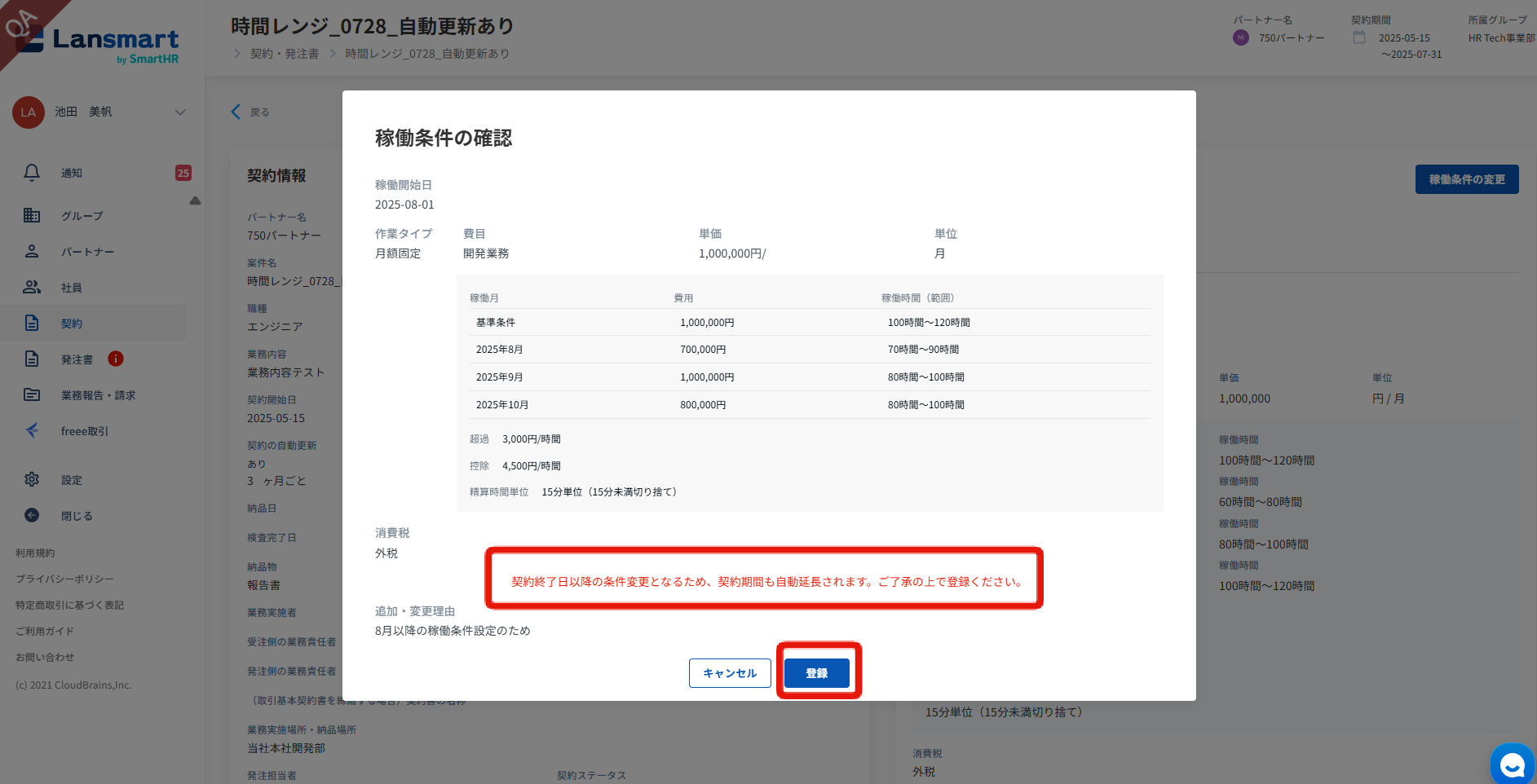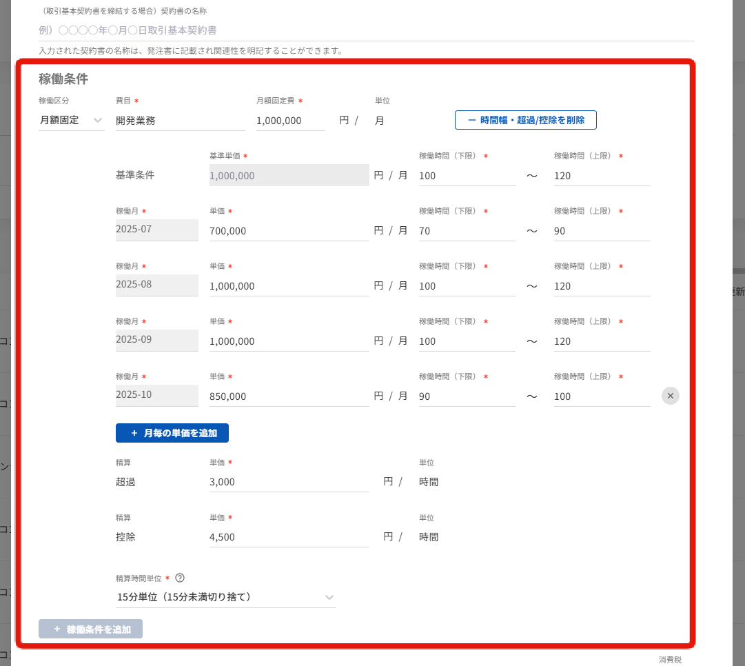 自動更新ありの場合、自動更新後の月の単価・稼働時間範囲は基準条件の基準単価、稼働時間範囲が適用されます。