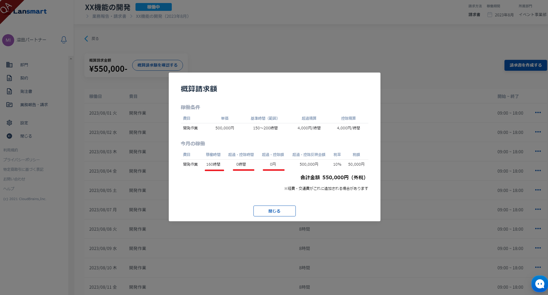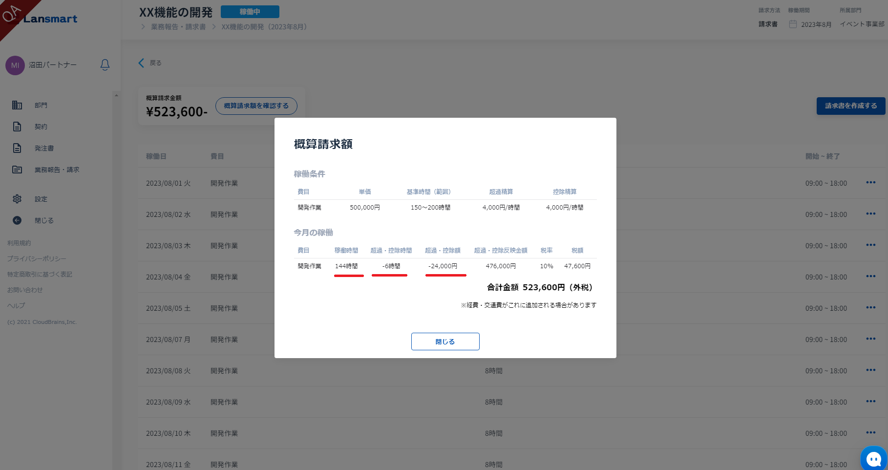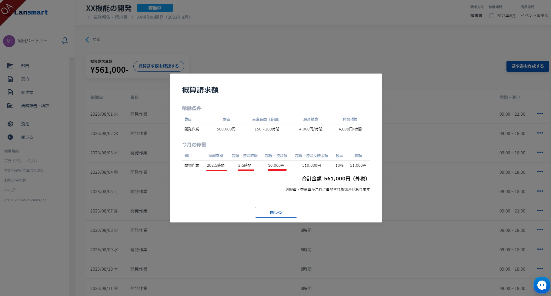 この機能によって、パートナー様は業務時間の入力だけを行えば、Lansmart by SmartHRで予め発注時に設定した時間レンジをもとに、自動で超過分と控除分を計算され、請求書を提出することができます。