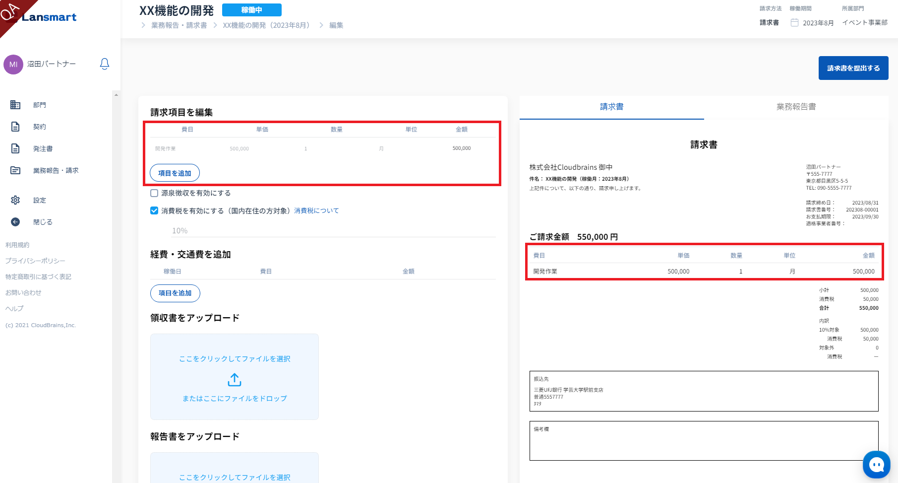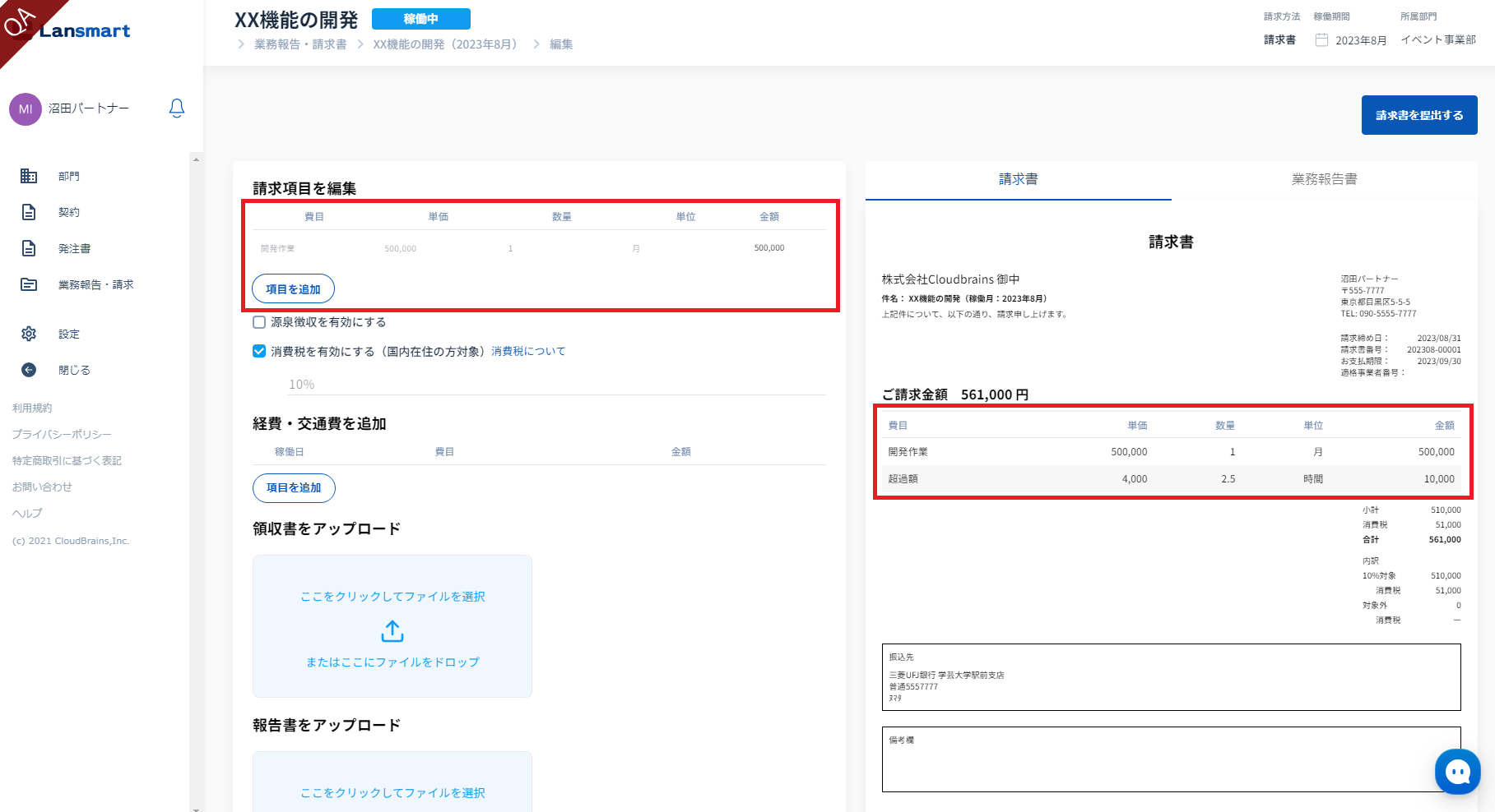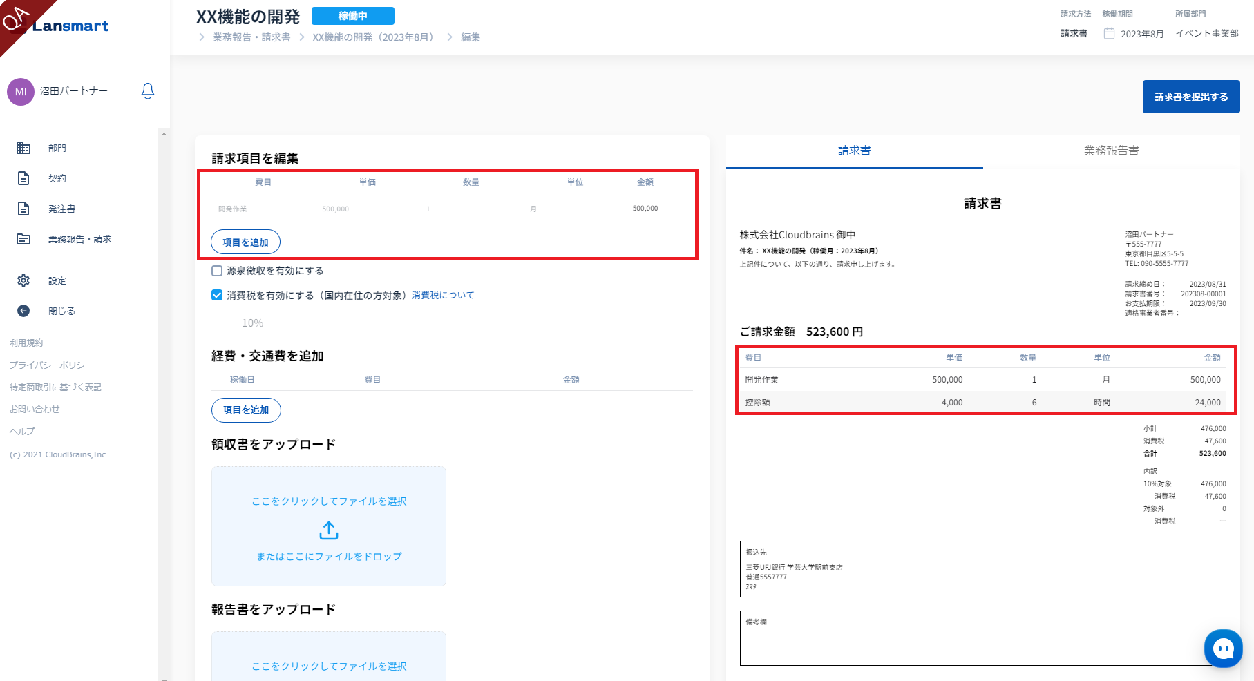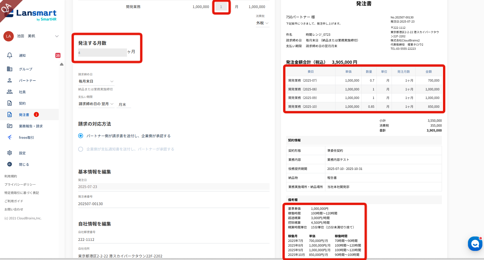 この機能によって、パートナー様は業務時間の入力だけを行えば、Lansmart by SmartHRで予め発注時に設定した時間レンジをもとに、自動で超過分と控除分を計算され、請求書を提出することができます。