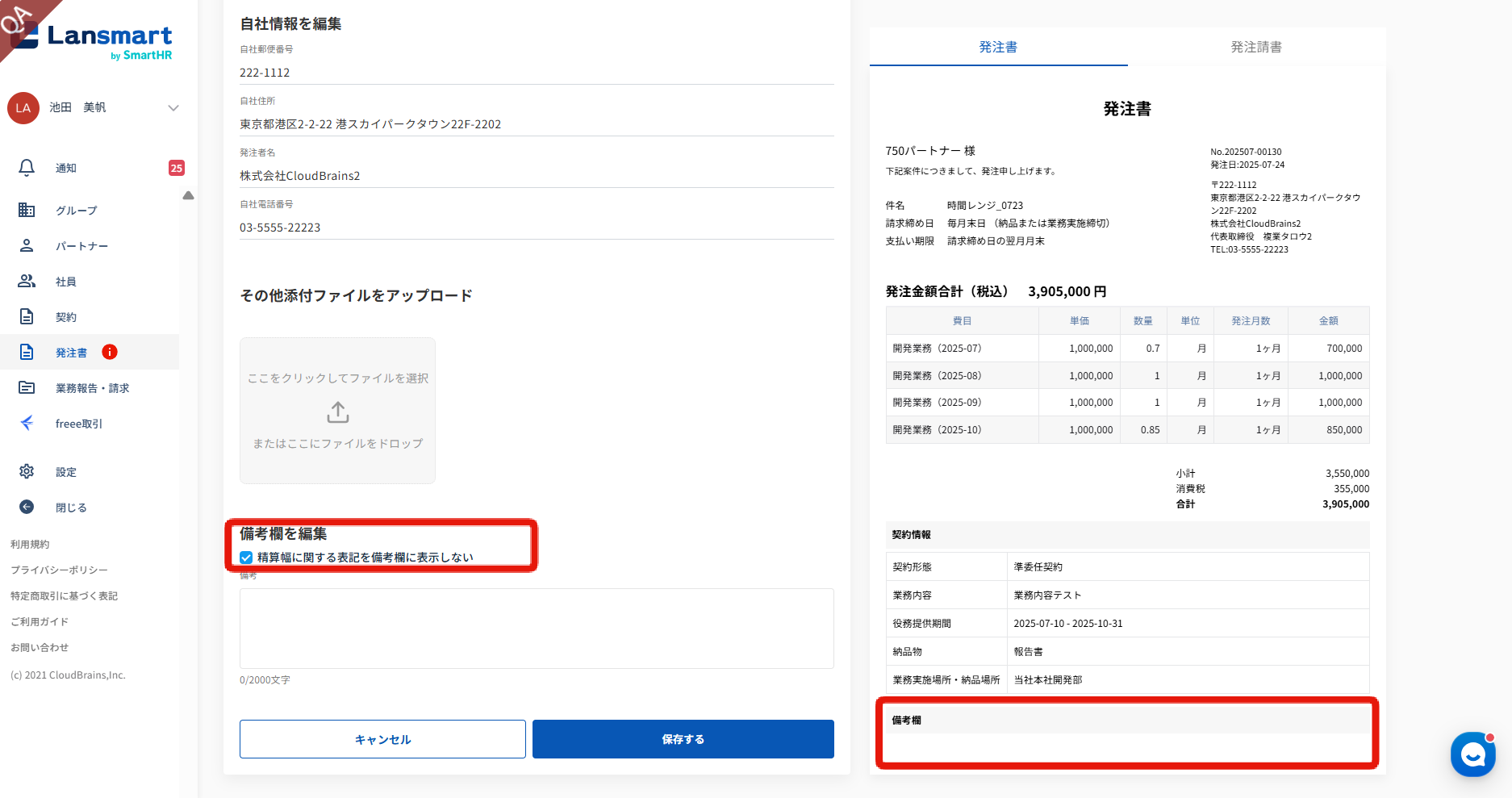 時間レンジを伴う報酬の稼働条件の場合、精算幅に関する内容が備考欄に自動で表示されます。 発注書作成画面の「備考欄を編集」の下に、「精算幅に関する表記を備考欄に表示しない」というチェックボックスがございますので、精算幅に関する記載を非表示にされたい場合は、☑をつけてください。 デフォルトは、チェックオフになっています。 ☑を付けた場合も、「備考欄を編集」に入力した内容は発注書に反映されます。