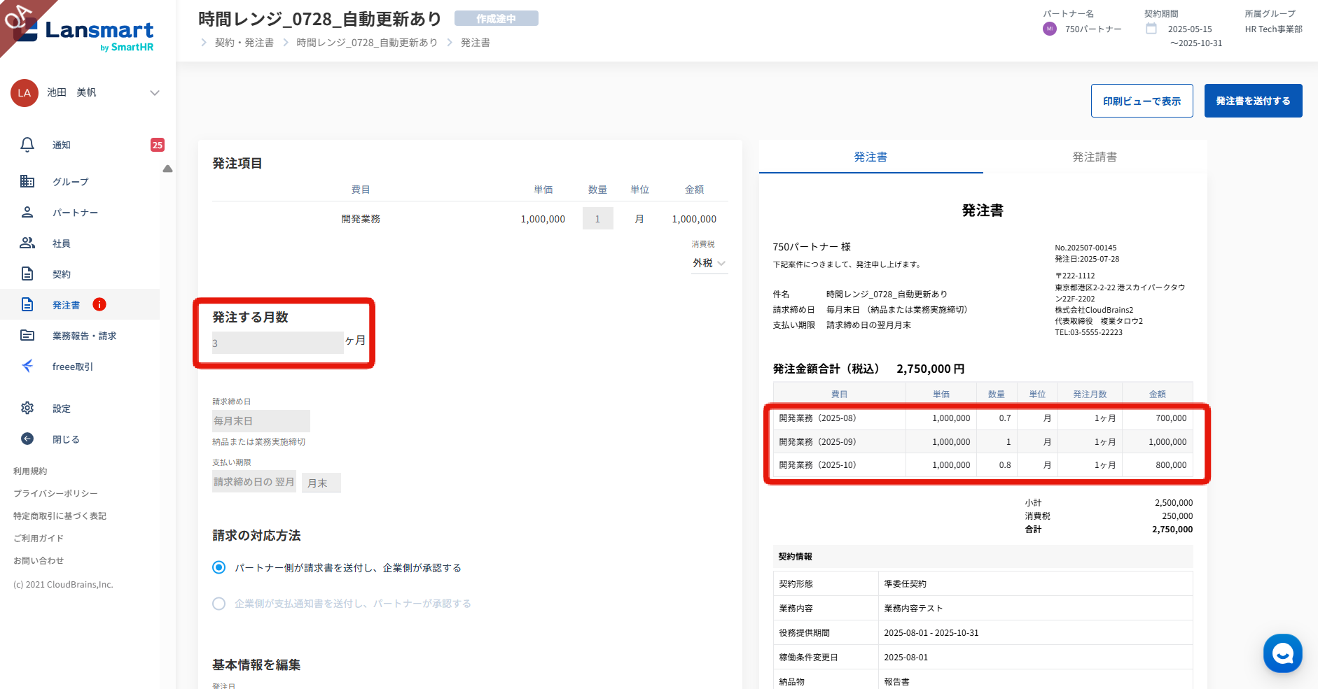 稼働条件変更の登録ボタンをクリックすると、発注書作成画面に遷移します。内容を確認いただき、問題なければ送付してください。