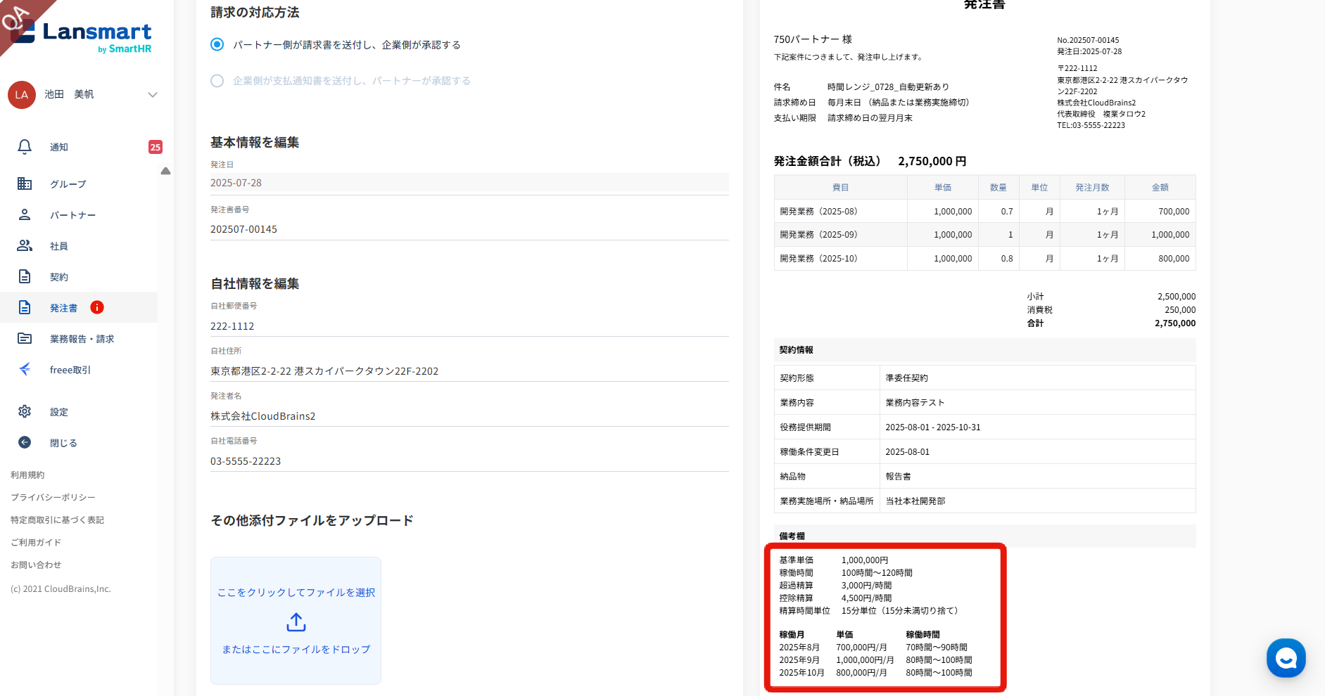 基準単価、稼働時間、超過精算額、控除精算額、精算時間単位、各稼働月ごとの単価、稼働時間範囲は、稼働条件で入力した内容が発注書の備考欄に自動で反映されます。