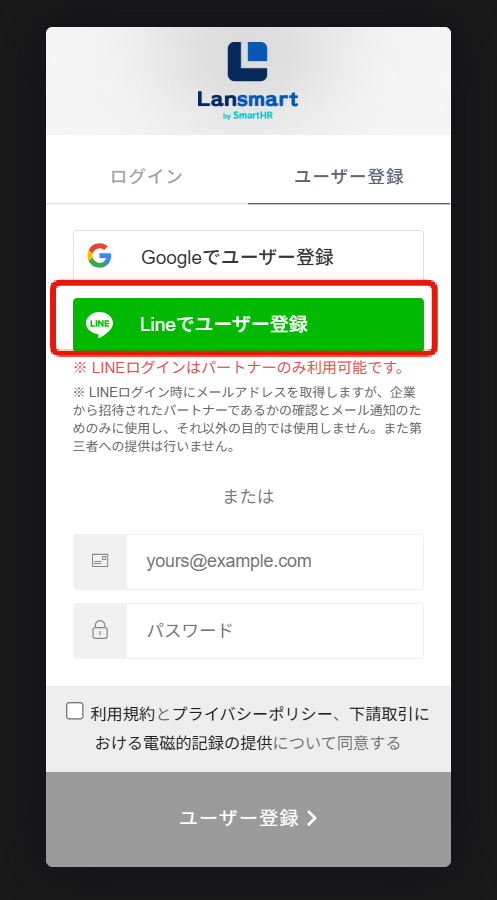 「LINEでユーザー登録」と表示されていれば、LINEでの登録が可能です。