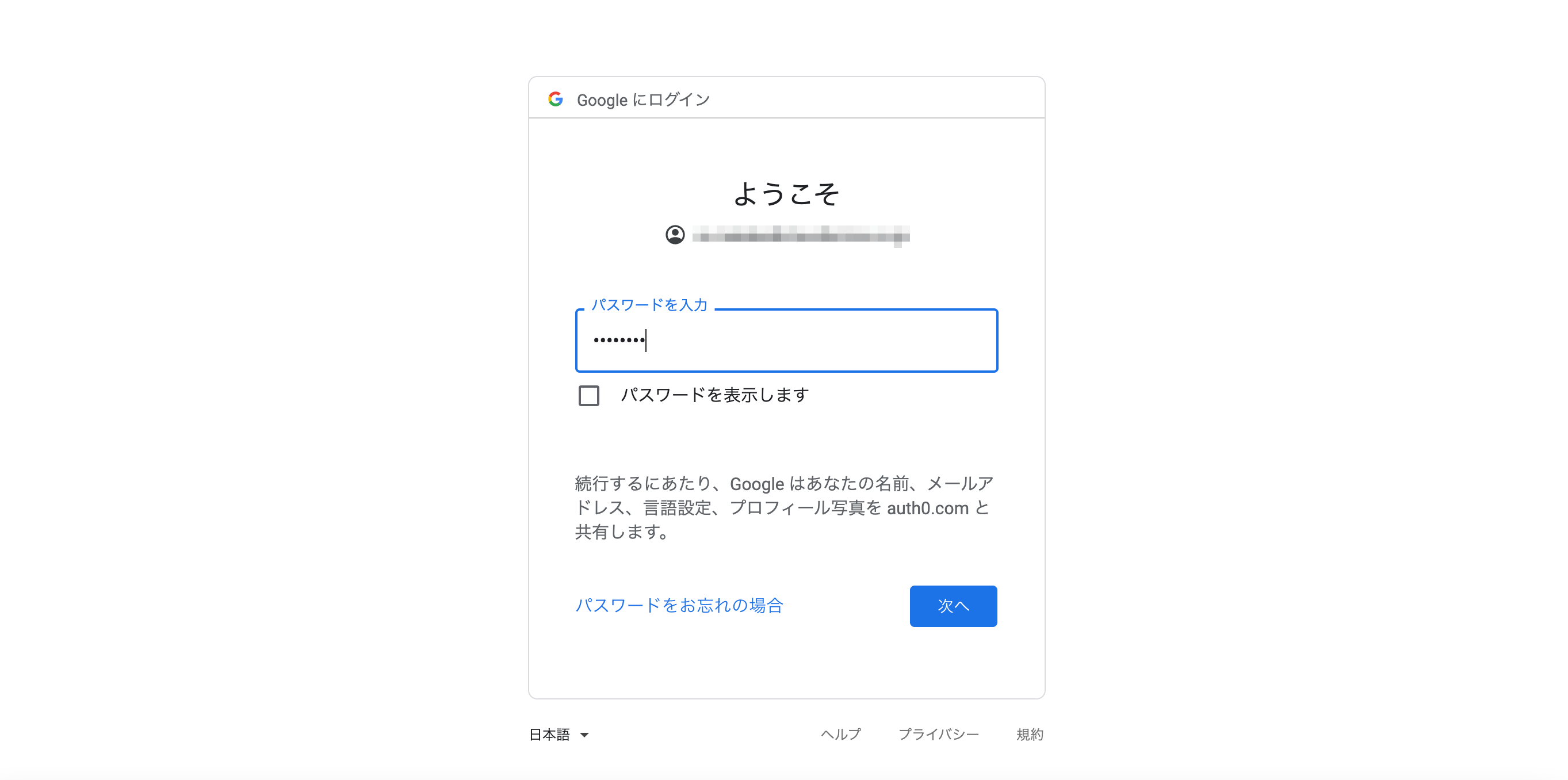 先ほどのGoogleのメールアドレスに対応するパスワードを入力します。