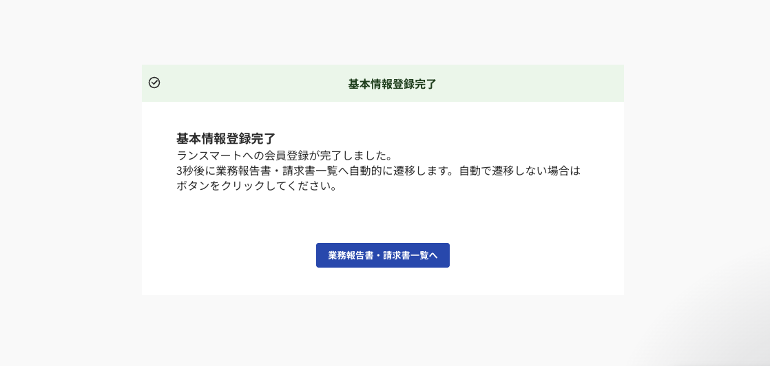登録が完了すると、「基本情報登録完了」のメッセージが表示され、3秒後に業務報告書・請求書一覧へ遷移します。