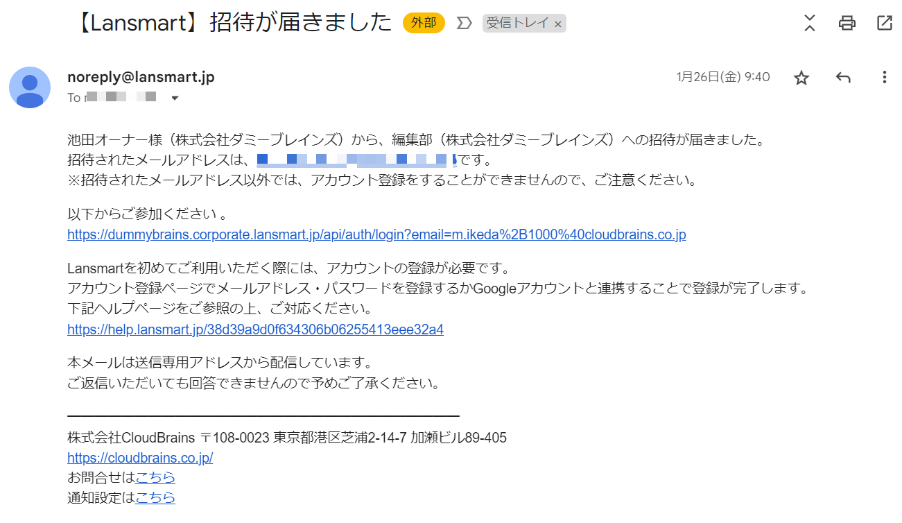 メール件名「【Lansmart】招待が届きました」という招待メールが届きますので、本文内にあるURLをクリックし、アカウント登録を行います。 招待されたメールアドレスが記載されていますので、ご確認ください。 ※招待されたメールアドレス以外では、アカウント登録ができませんので、ご注意ください。