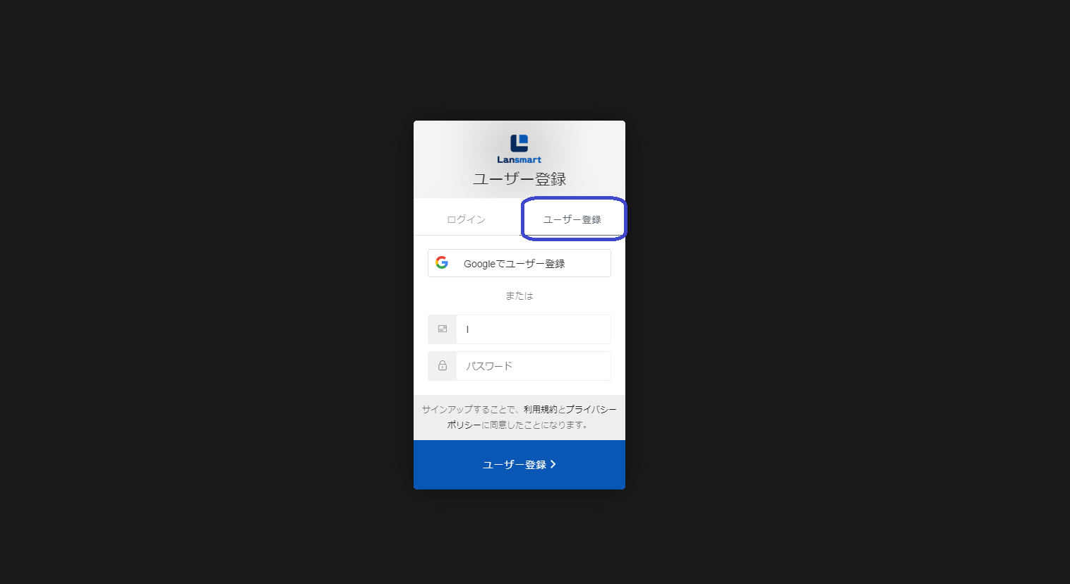 メールアドレスとパスワードを入力し、「ユーザー登録」ボタンをクリック
