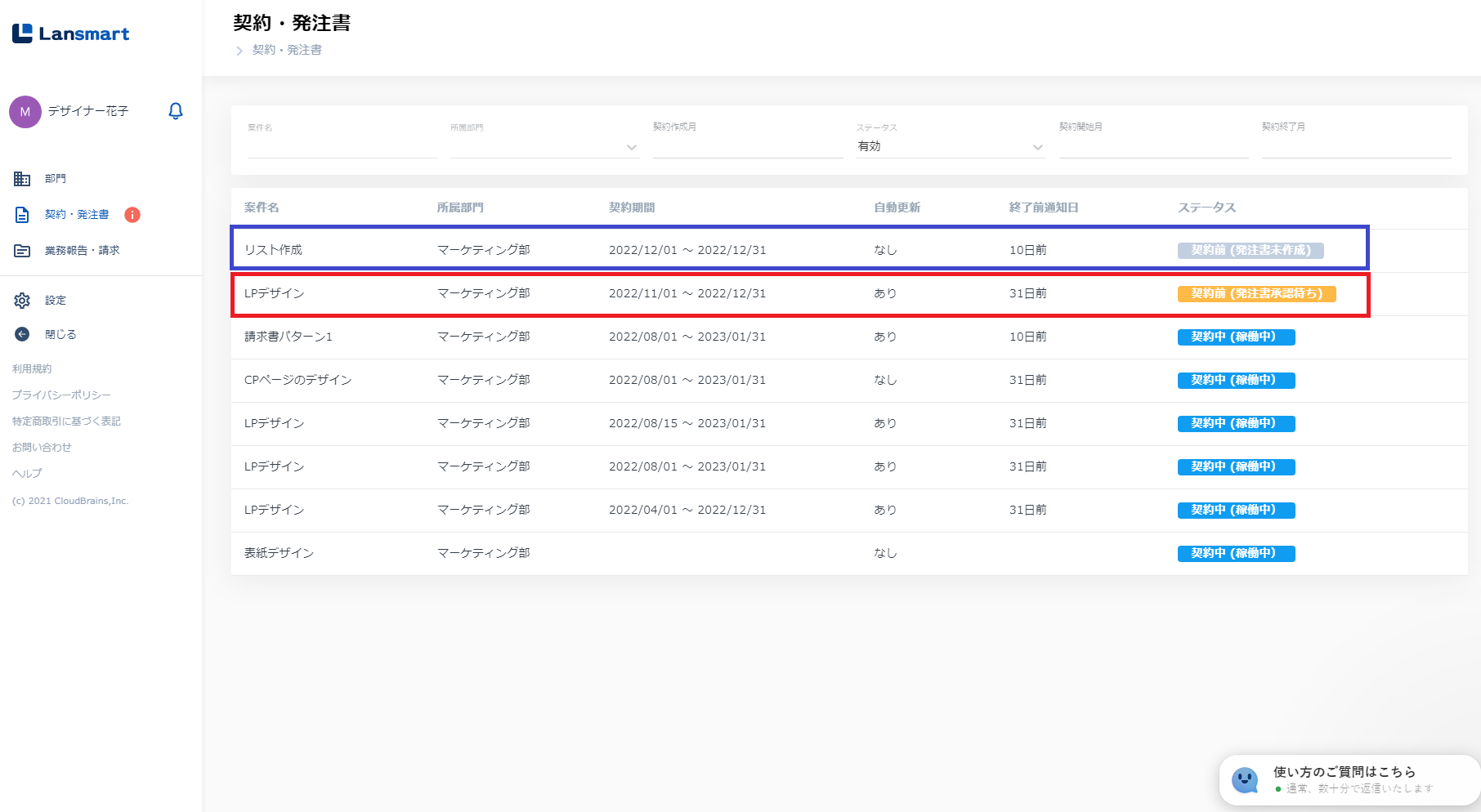 業務報告は、パートナー様が発注書を承認したタイミングで、左メニュー「業務報告・請求」一覧に生成されます。 発注書の承認が完了しているか確認してください。 左メニュー「契約・発注書」をクリックいただき、「発注書承認待ち」ステータスになっている契約が、パートナー様の承認が必要な契約です。(下記画面赤枠) 「発注書未作成」「発注書未送付」ステータスになっている場合は、企業様に発注書の作成・送付を依頼してください。(下記画面青枠)