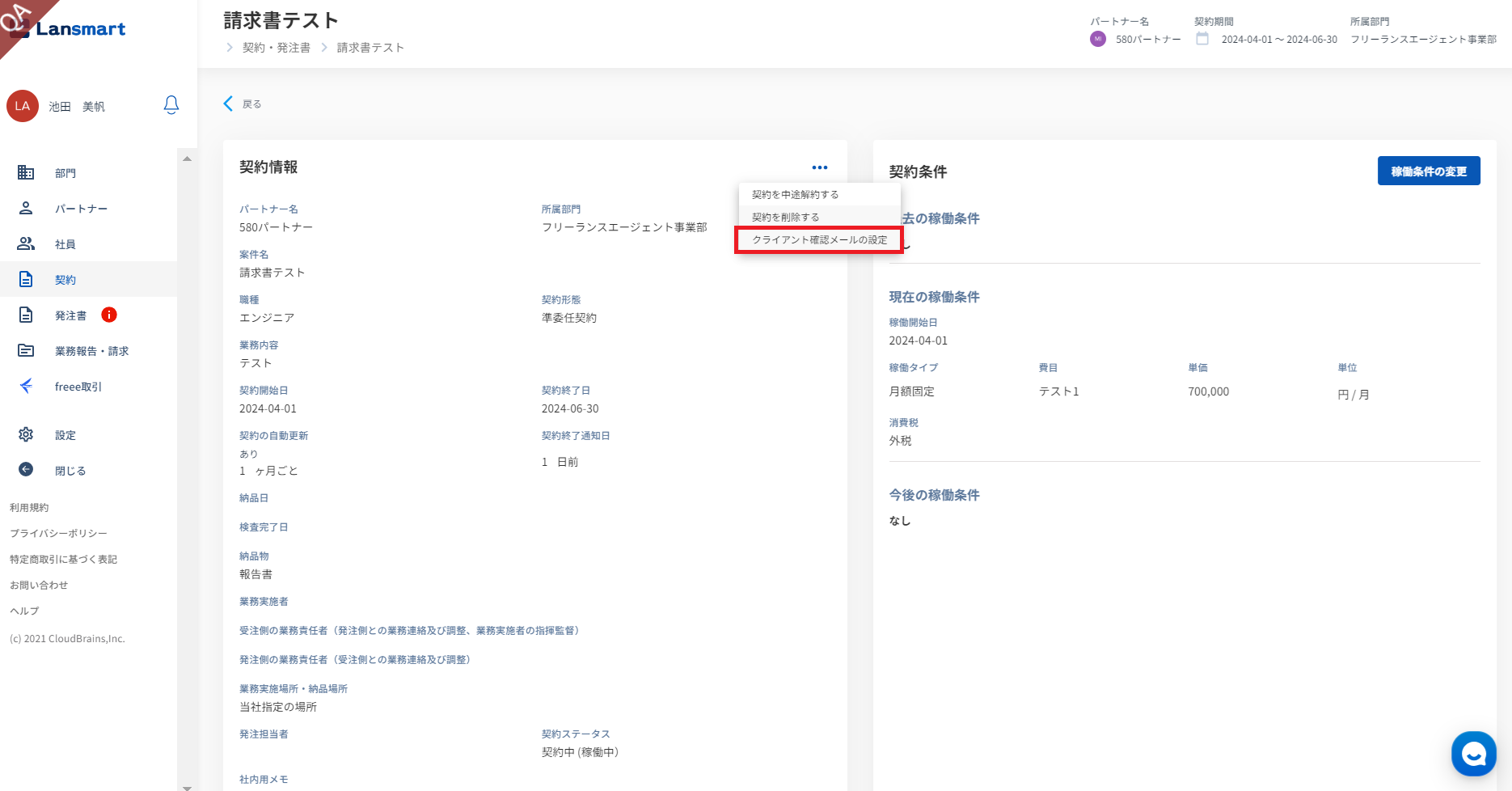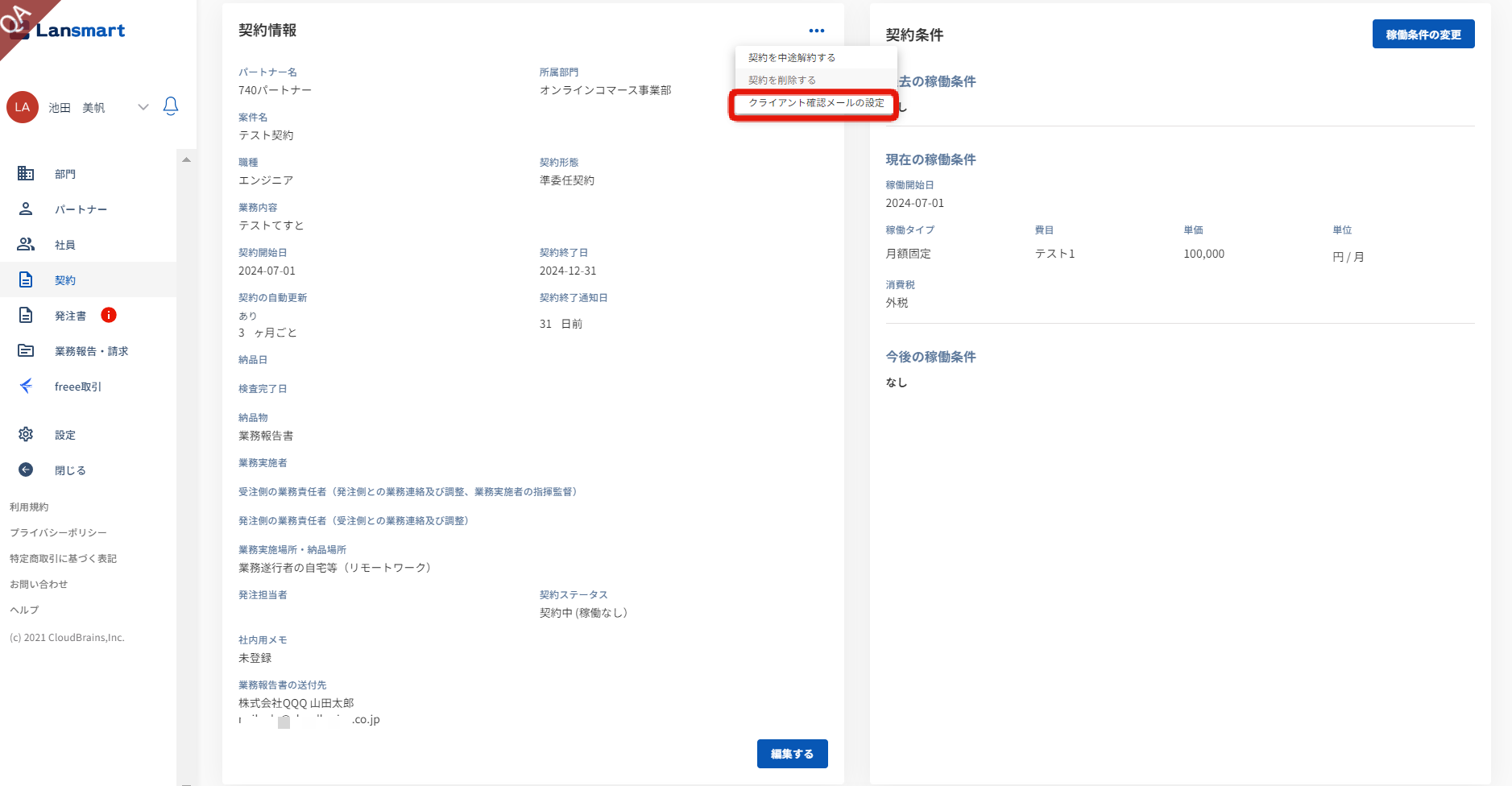 設定内容を変更したい場合は、契約情報の三点リーダーから「クライアント確認メールの設定」をクリックし、送付に必要な情報の変更をしてください。
