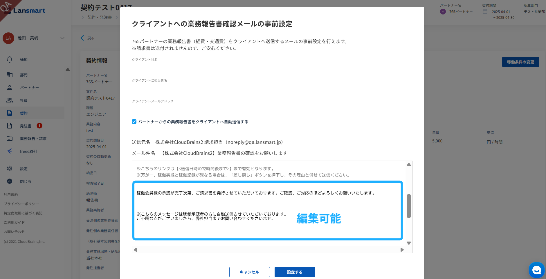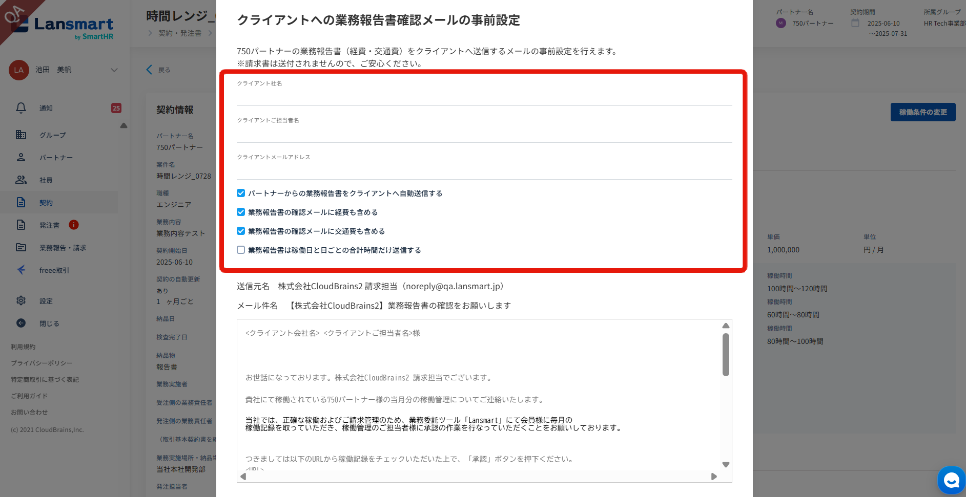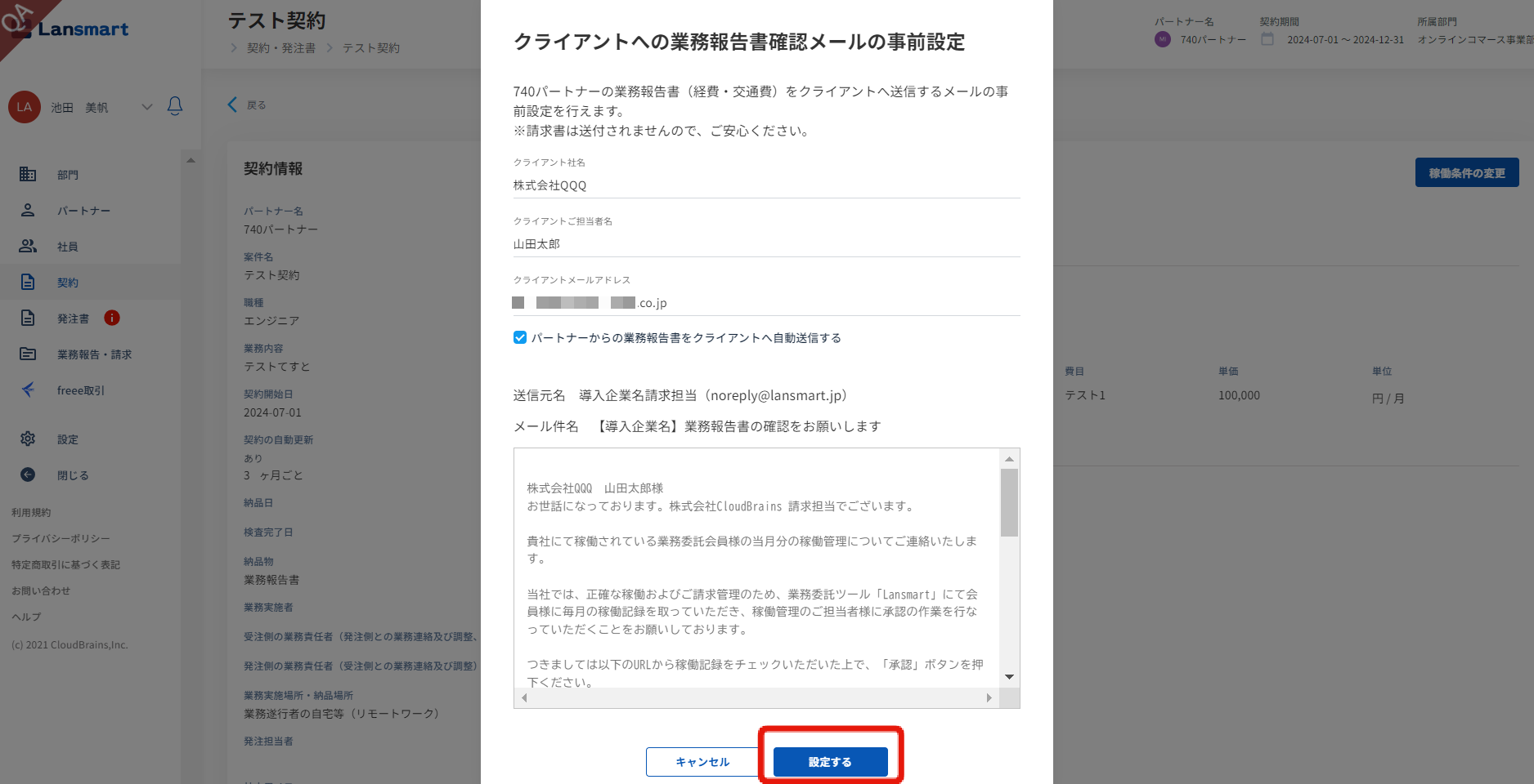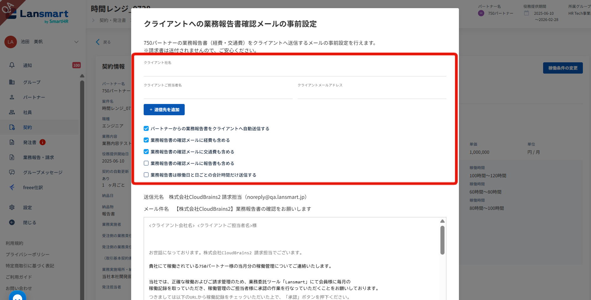 「クライアントへ業務報告書確認メールの事前設定」のモーダルが開きますので、送付に必要な情報を入力します。