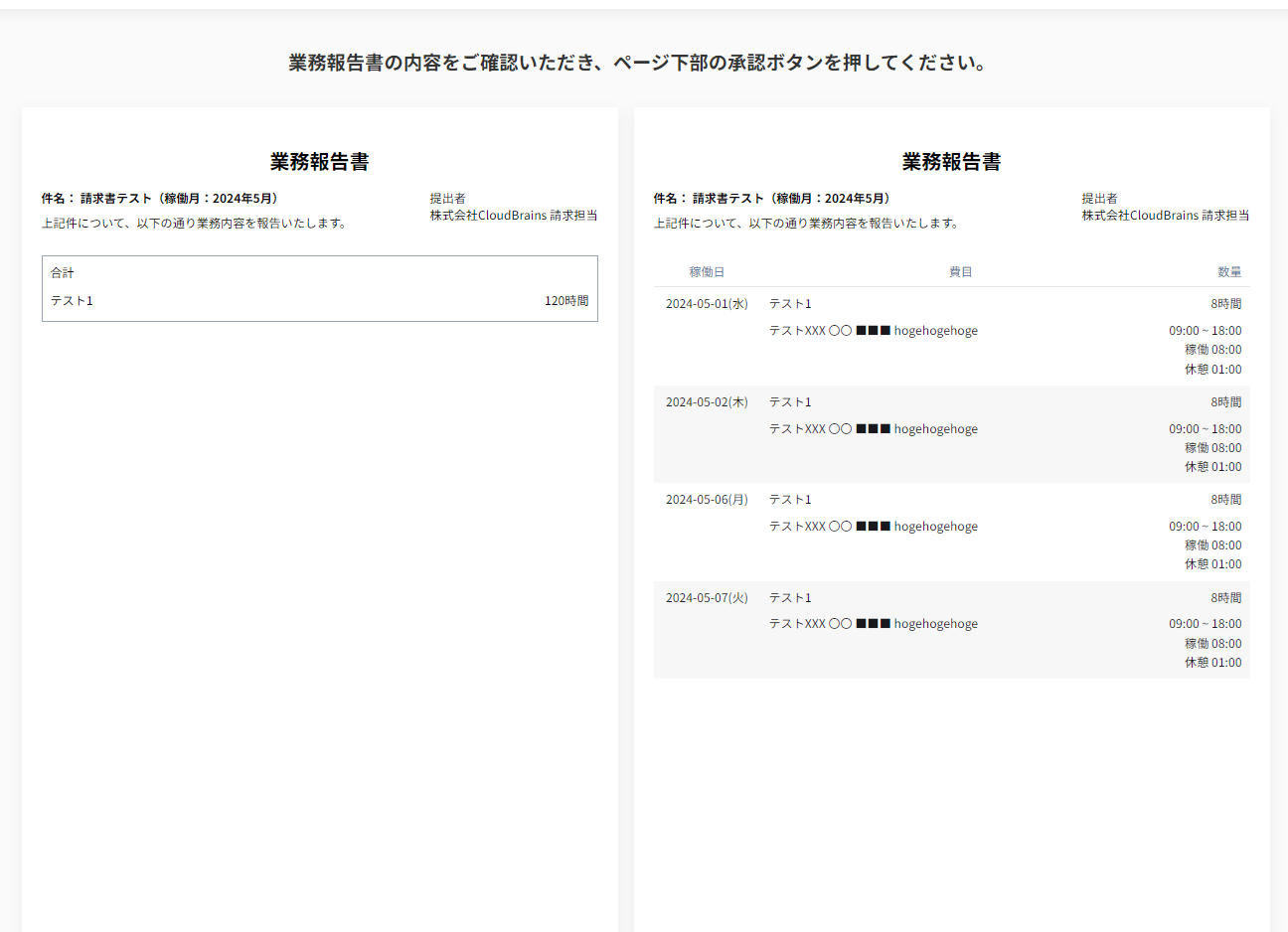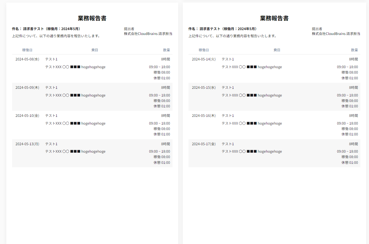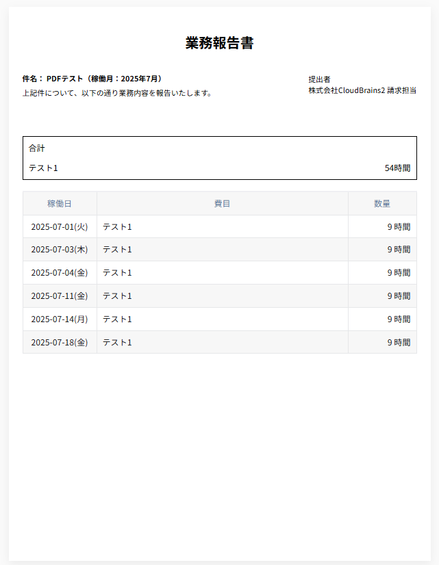 業務報告書は稼働日と日ごとの合計時間だけ送信する