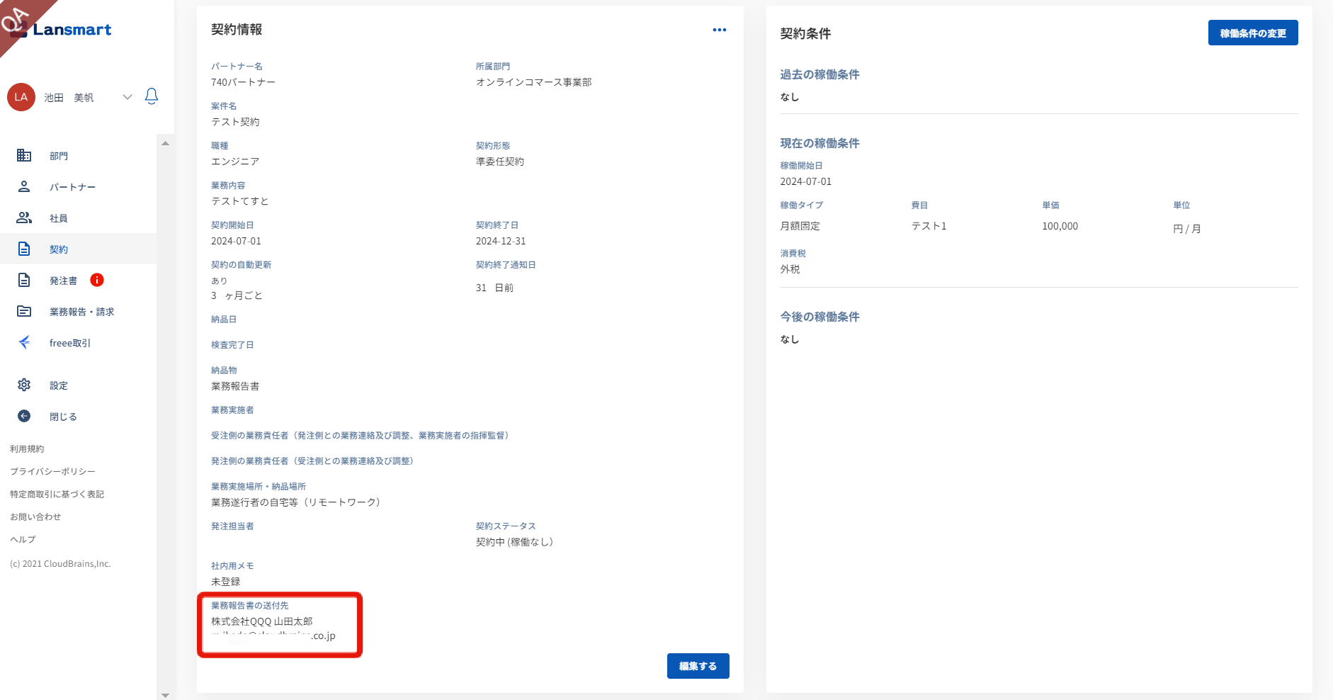 契約情報に業務報告書の送付先が表示されます。