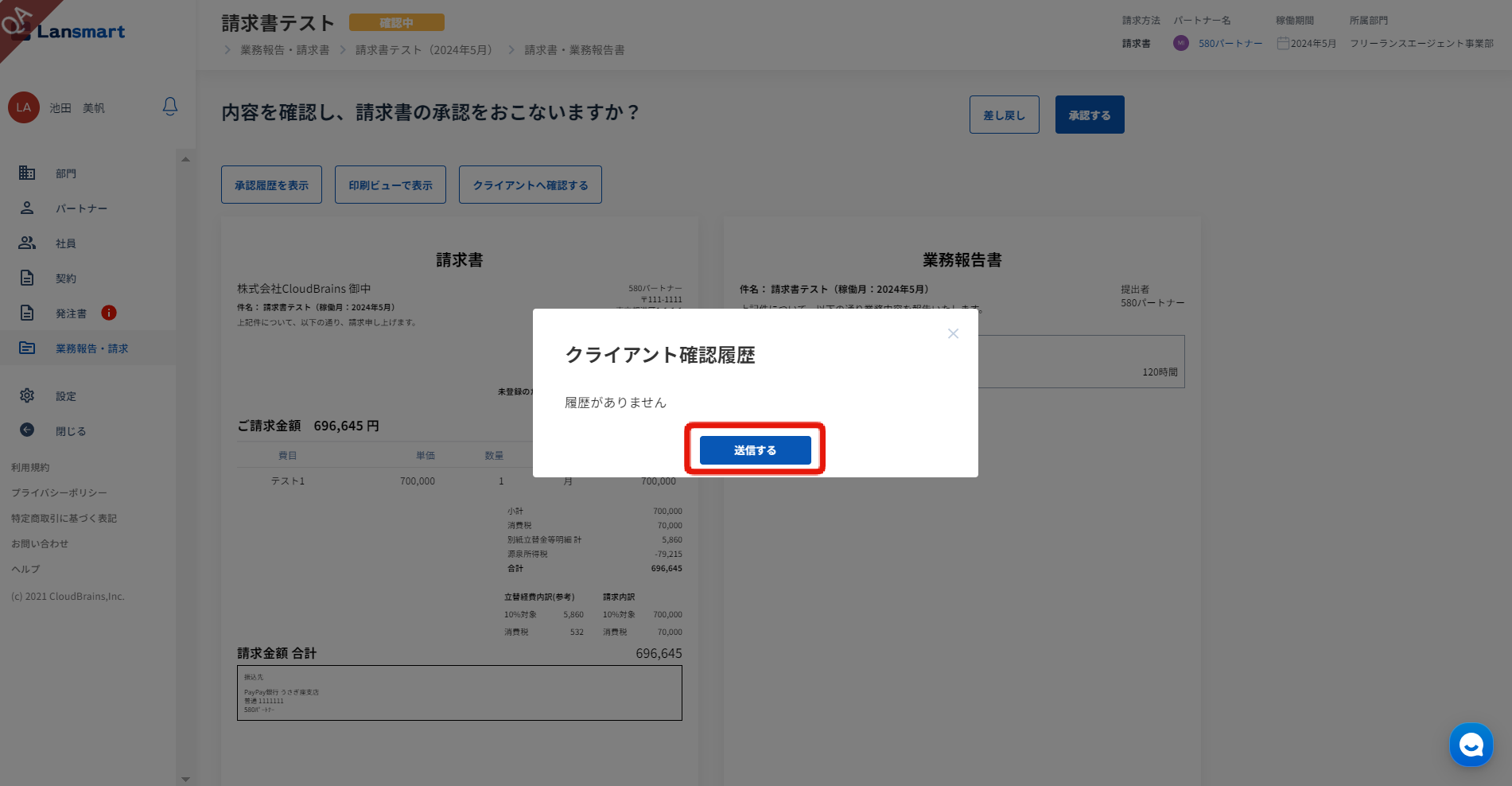クライアント確認履歴のモーダルが開きますので、「送信する」ボタンを押します。