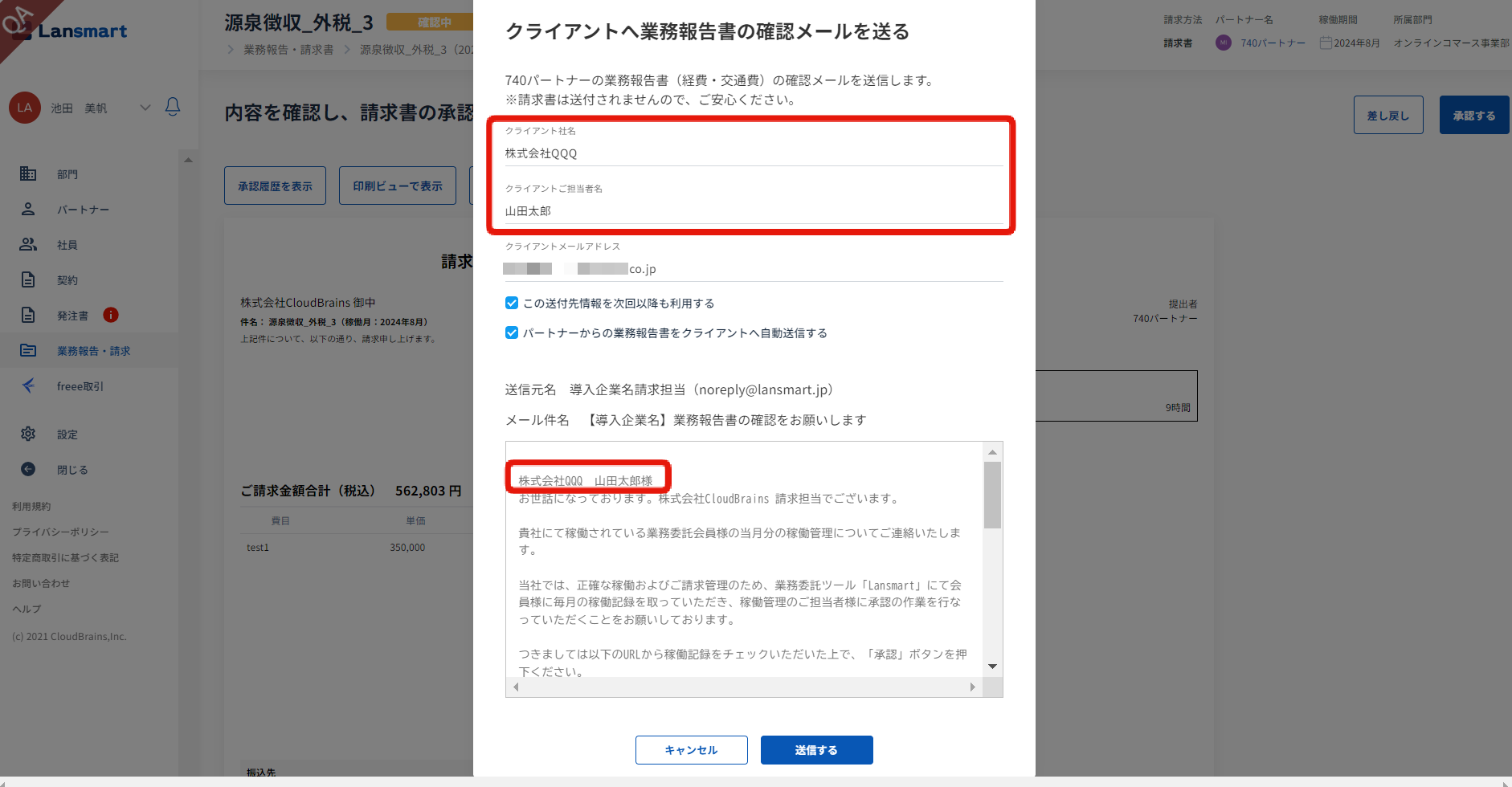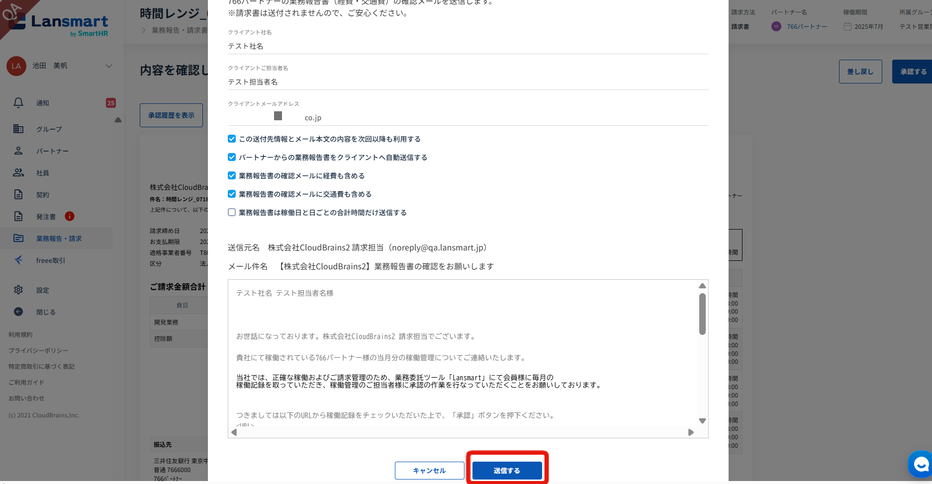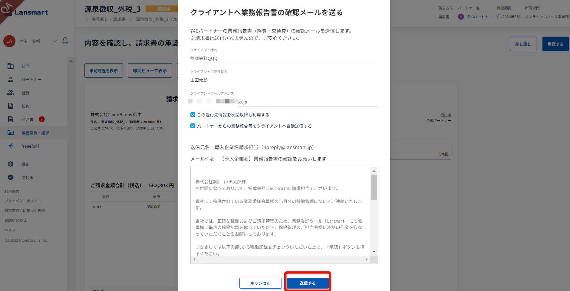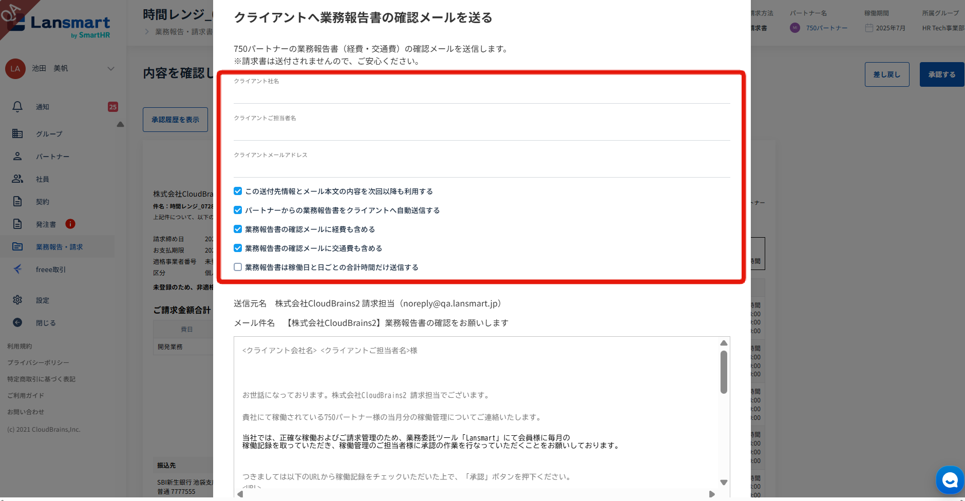 「クライアントへ業務報告書の確認メールを送る」のモーダルが開きますので、送付に必要な情報を入力します。